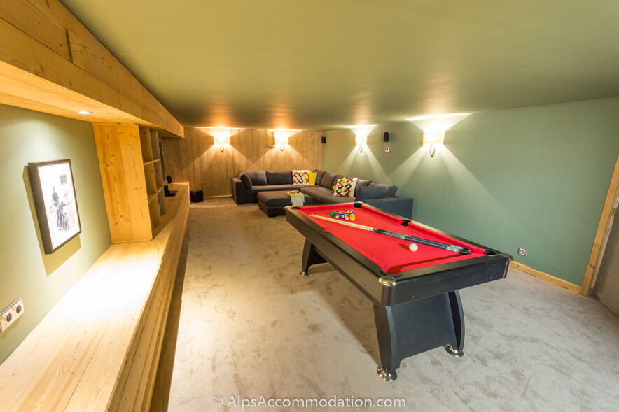 Un grand point fort du Chalet Balthazar-Jeroboam se trouve au niveau du vaste sous-sol. Ce troisième salon est constitué d’une salle de jeu et d’un home-cinéma, une pièce fantastique dont tous pourront profiter. A l’une des extrémités de la pièce se trouve la table de billard, tandis que de l’autre côté se trouve un imposant canapé d’angle, parfaitement placé pour profiter du téléviseur smart LCD de 152cm et son lecteur Blu-Ray, ses enceintes son-surround et la console de jeu Xbox 360. Ce canapé est également convertible en lit double. Une laveuse-sécheuse combinée est également située à cet étage. Un second lave-linge et sèche-linge individuels sont situés dans l’autre partie du chalet à l’étage supérieur. La Wifi est bien-entendu disponible à travers toute la propriété.