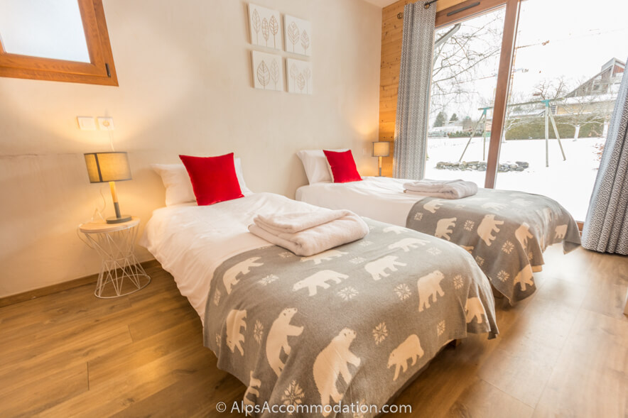 La chambre 5 est une chambre à lits jumeaux très cosy, située à l’extrémité sud du chalet. Elle bénéficie d’un accès direct au jardin par une porte vitrée coulissante, et d’une vue épatante sur une superbe cascade. Un placard intégré fournit un ample espace de rangement, tandis que la salle de bain comprend une douche et un meuble-lavabo. Les WC sont situés à proximité. Cette chambre peut être configurée en chambre double (Queen size) sur demande préalable.