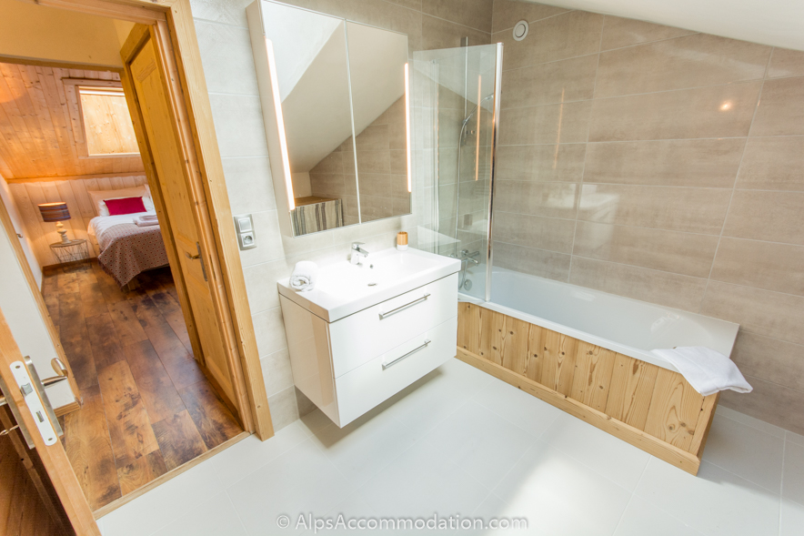 Les chambre 6, 7 et 8 se partagent 2 salles de bain situées au même étage. La première est une salle de bain familiale comprenant baignoire avec douche intégrée, un meuble-lavabo moderne et une armoire de toilette. Cette pièce est également équipée d’un lave-linge et sèche-linge individuels. Dans la deuxième salle de bain au carrelage moderne à effet de marbre, on trouvera une douche de plus grande taille ainsi qu’un meuble-lavabo. Un WC séparé se situe de l’autre côté du hall.
