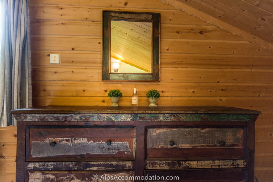 La chambre 7, une autre grande chambre, comprend un lit double (peut être configuré en lits jumeaux sur demande) habillé de couleurs douces. Le lit est positionné en face d’une grande fenêtre exposée sud, offrant une vue imprenable sur le relief alpin. Une magnifique commode en bois rustique et une penderie intégrée servent pour un excellent espace de rangement. Disponible à partir de juin 2019, cette chambre aura un canapé-lit (largeur 70cm) pour 1 personne.