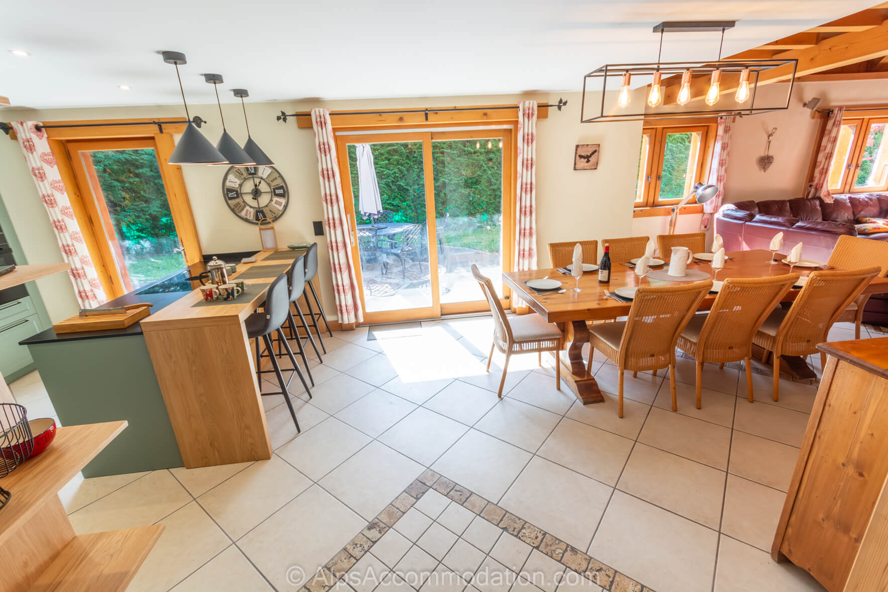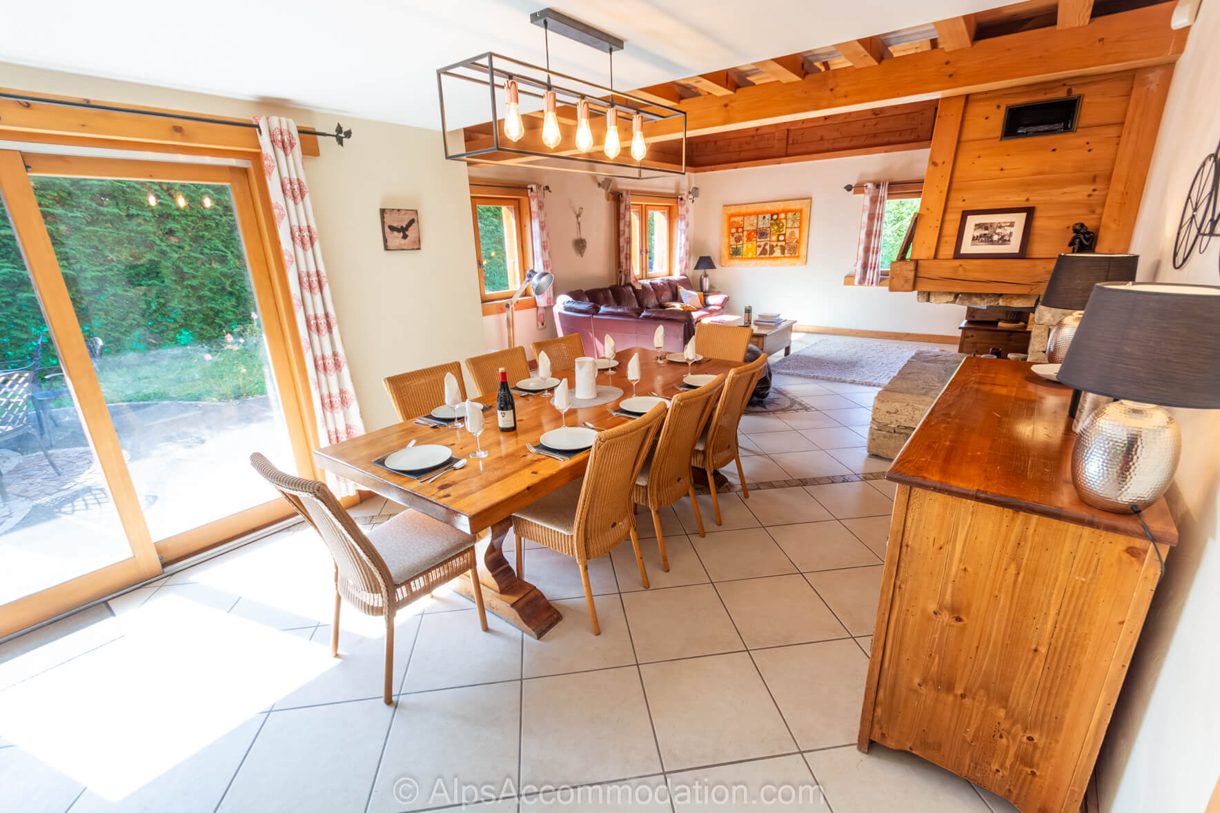 Positionné à l’opposé de l’impressionnante cheminée et profitant de sa chaleur et lueur se trouve l’espace lumineux de la salle à manger. Une large table de bois peut confortablement accueillir 10 personnes, et offre de jolies vues à travers les portes fenêtres coulissantes donnant sur le jardin. Un système de musique vous offre la possibilité d’accompagner vos repas d’une bande-son relaxante.