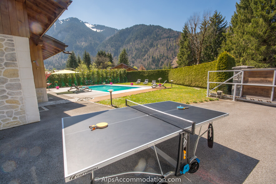Le jardin privé et les installations extérieures du Chalet du Mont de Fraises en sont les vrais atouts. Le chalet est situé à l’intérieur d’un grand terrain privé de 1200m², qui bénéficie d’une situation ensoleillée tout au long de la journée, avec des coins ombragés pour les longues journées d’étés les plus chaudes. Une haie mature entoure le jardin des 4 côtés et offre une intimité totale, sans toutefois bloquer les vues splendides sur les forêts et montagnes alentours. Le Chalet du Mont des Fraises dispose d’une exceptionnelle piscine de 9 mètres par 5, chauffée et ouverte de la fin mai à la mi-octobre, entourée d’une terrasse en bois et d’une pelouse. Chaises longues et grands parasols sont à la disposition des locataires. Une table de ping-pong pliable est disponible à l’extérieur dans le jardin, tandis que pendant la saison froide, elle peut être installée dans le spacieux double garage. Vers l’entrée du chalet se trouve un espace couvert et ombragé, et une grande table ronde, chaises et un excellent barbecue à gaz offrent de superbes possibilités de repas au grand air.
