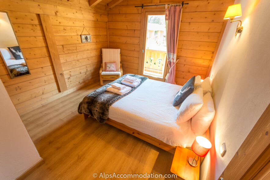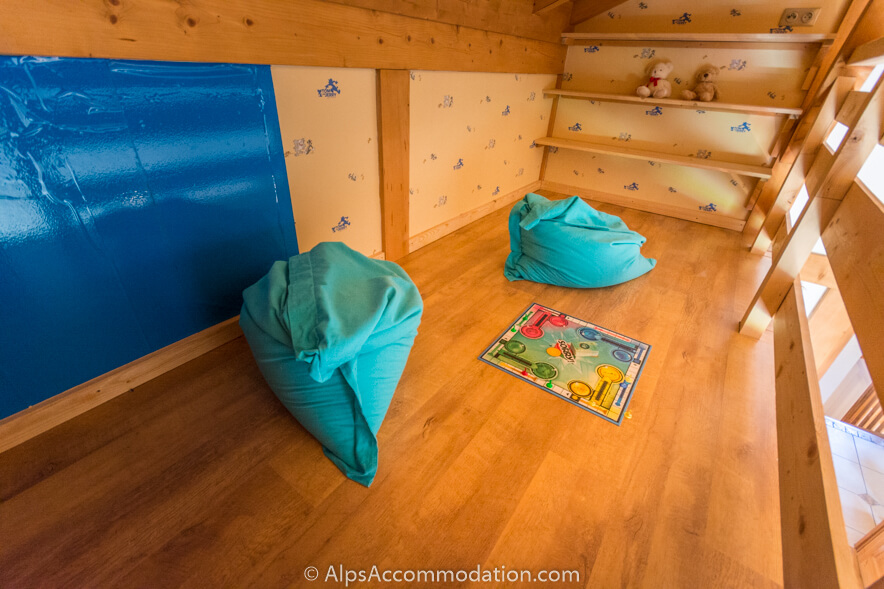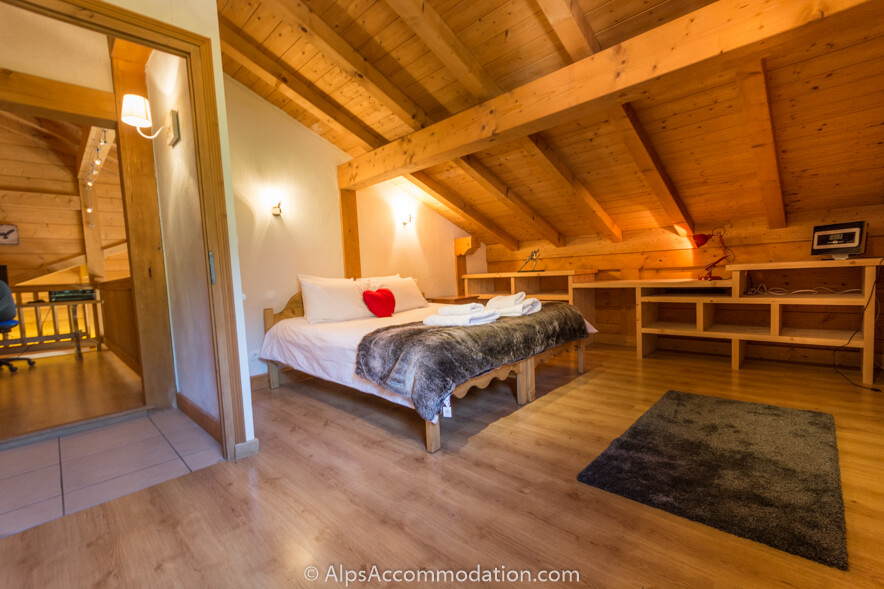 La chambre 3 est une fantastique chambre à lits jumeaux bénéficiant de son propre accès à un grand balcon ensoleillé et des vues splendides sur le relief alpin. Une échelle donne accès à une mezzanine unique qui offre un excellent espace pour les enfants, pour jouer et explorer. Un meuble coiffeuse est installé dans la chambre, tandis que l’armoire intégrée offre un bon espace de rangement.