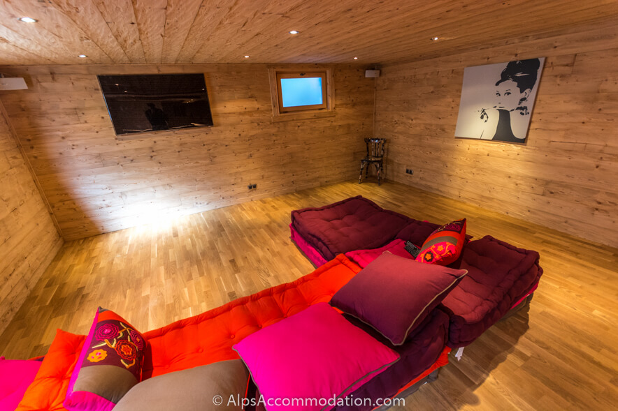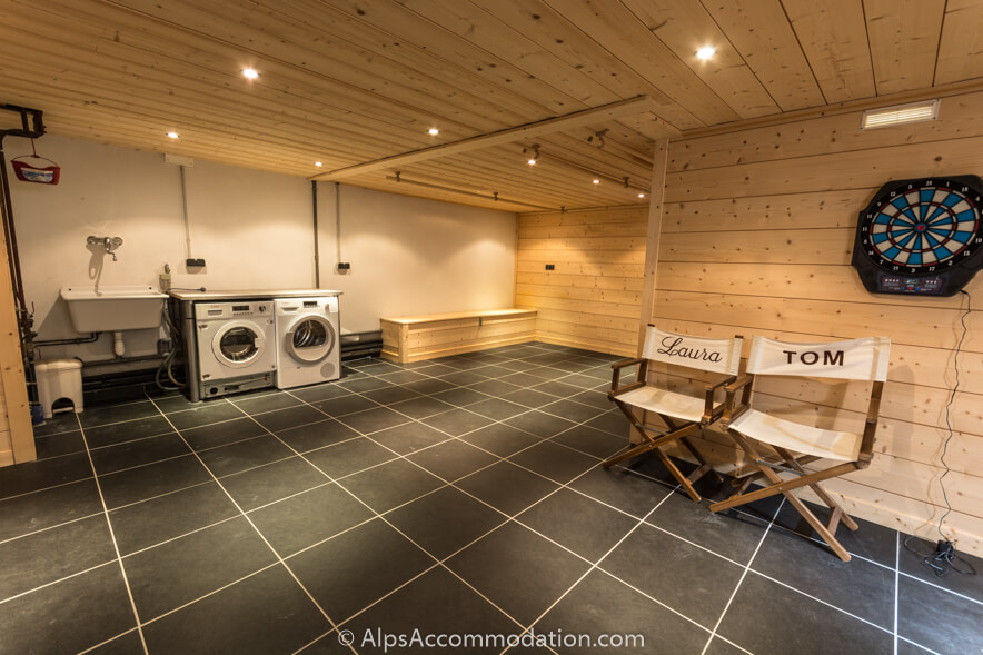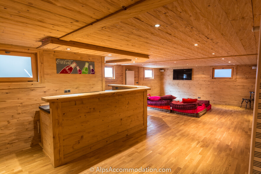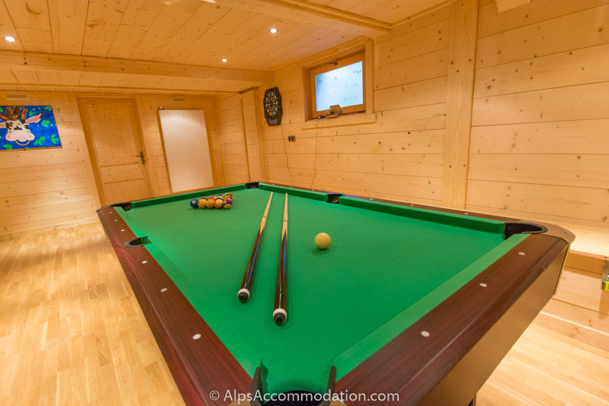 Le niveau inférieur du chalet est occupé par une spacieuse salle de bar / cinéma avec canapé, téléviseur LCD et son excellent système audio. Une table de billard se trouve dans la salle de jeu séparée. Tout ceci vous assurant de superbes vacances, que vous souhaitiez regarder un bon film ou simplement vous détendre ! Vous trouverez également à ce niveau un grand local pour les chaussures et équipement d’extérieur. Un lave-linge, un sèche-linge indépendant et un jeu de fléchettes sont aussi à votre disposition.