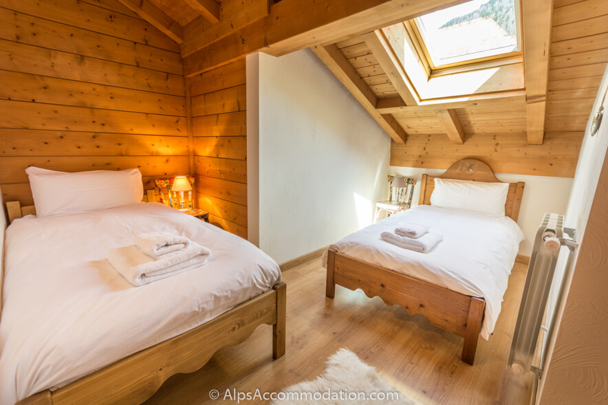 La chambre 5 est une chambre douillette à lits jumeaux ornée d’élégantes décorations savoyardes. Le grand vélux laisse entrer la lumière naturelle donnant une ambiance aérienne et énergisante, et permet d’apercevoir les forêts et pics environnants. Une armoire intégrée offre un espace de rangement.