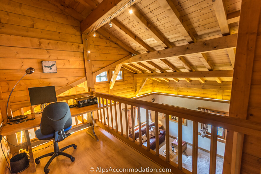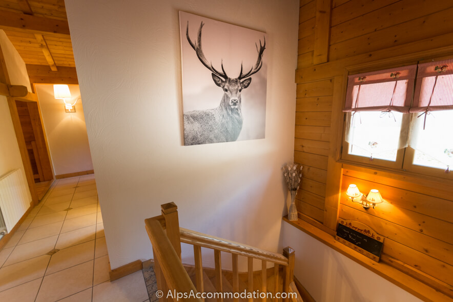 Un large escalier, orné de décorations locales élégantes, mène au niveau supérieur du chalet où se trouvent 4 chambres à coucher ainsi qu’une salle de bain familiale, tandis qu’un coin bureau sur la mezzanine surplombe la salle de séjour et offre un coin de tranquillité. La chambre principale ou 5ème chambre se trouve au niveau de l’entrée.