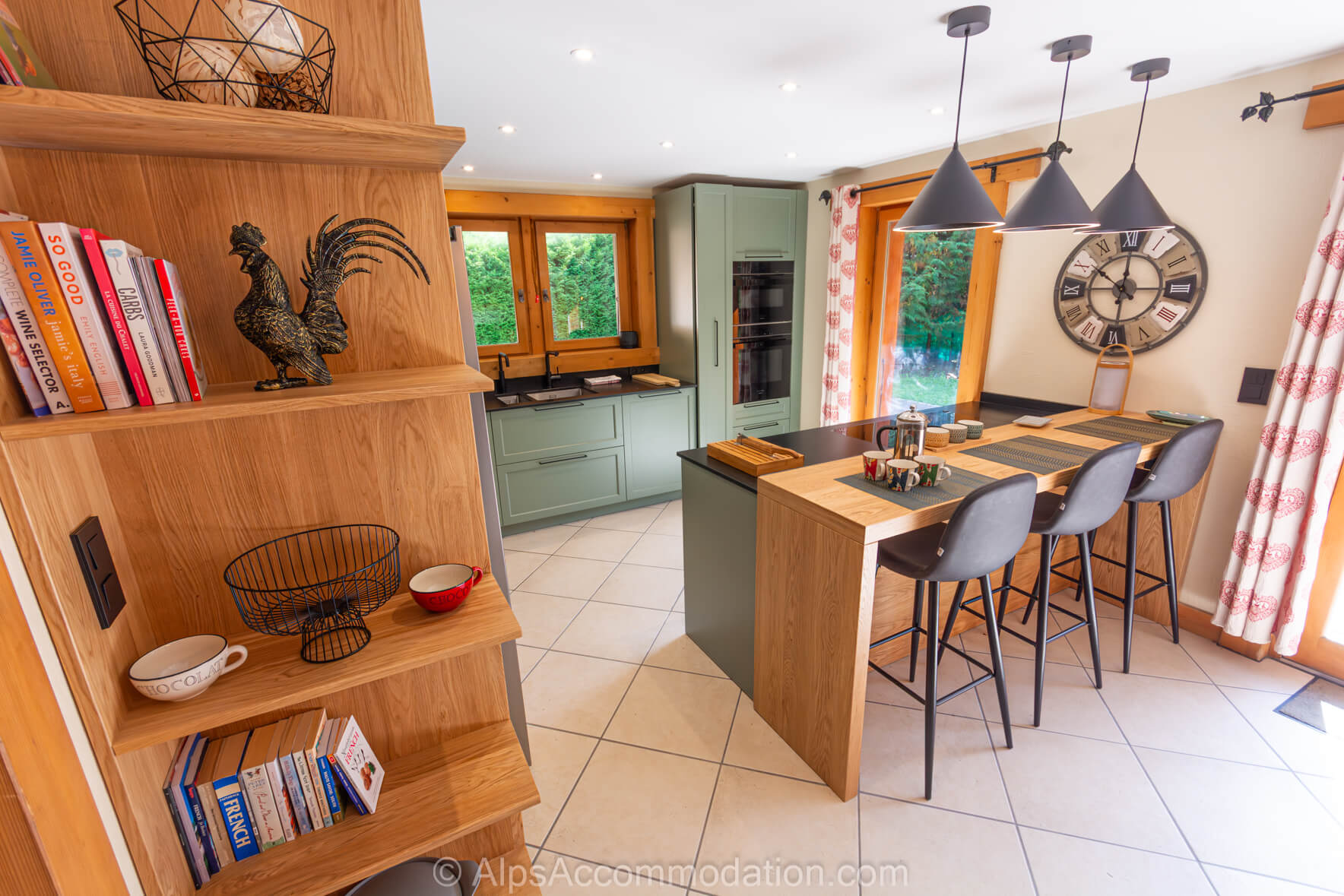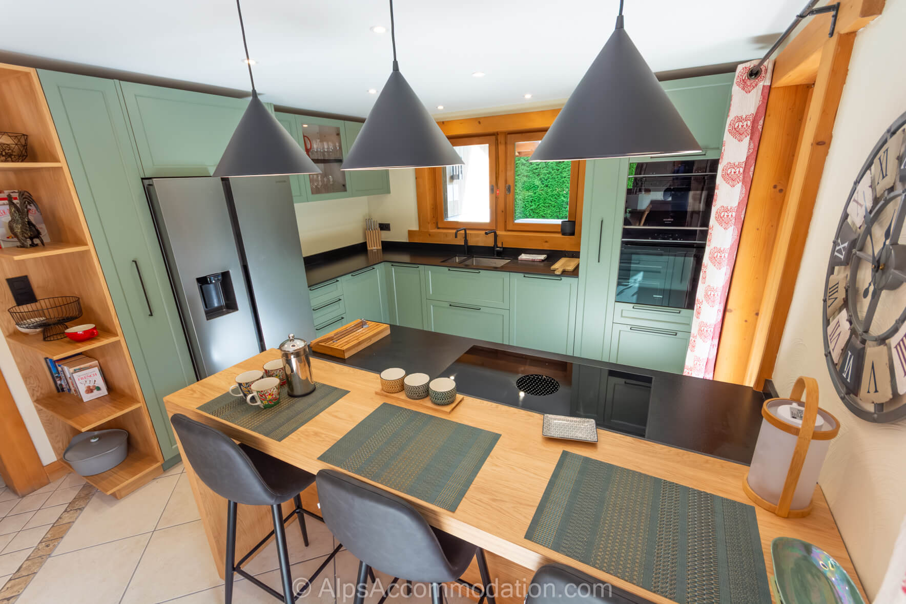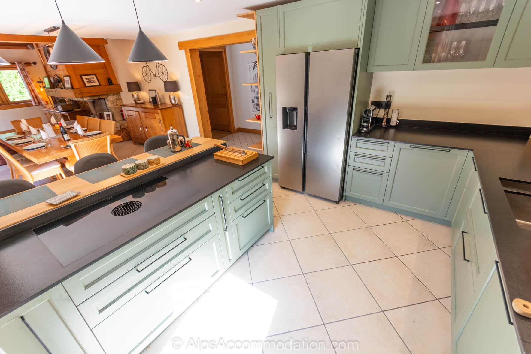 A l’autre bout de ce grand espace se trouve une cuisine superbement équipée comprenant une plaque de cuisson 4 feux, un four électrique à chaleur tournante, un lave-vaisselle, micro-onde, et un grand réfrigérateur-congélateur à l’américaine. Une machine à café Nespresso et un mousseur à lait électrique ajoute une touche de luxe, tandis que les amateurs de fromage ou ceux qui souhaiteraient goûter aux spécialités locales pourront profiter du caquelon à fondue et de la machine à raclette. Un aménagement efficace, intégrant des plans de travail en granite et une table de petit déjeuner, donne une large surface de préparation qui fera le bonheur des cuisiniers les plus audacieux !