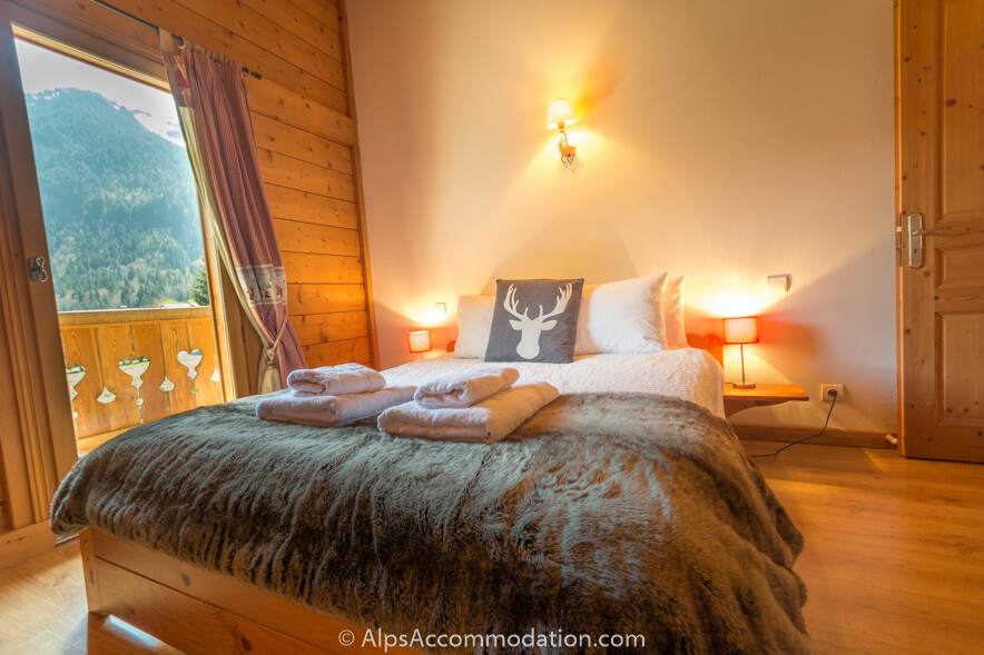 Les chambres 3 et 4 se partagent un grand balcon exposé à l’est qui offre de superbes vues en direction des sommets enneigés surplombant la magnifique réserve naturelle de Sixt Fer-à-Cheval.