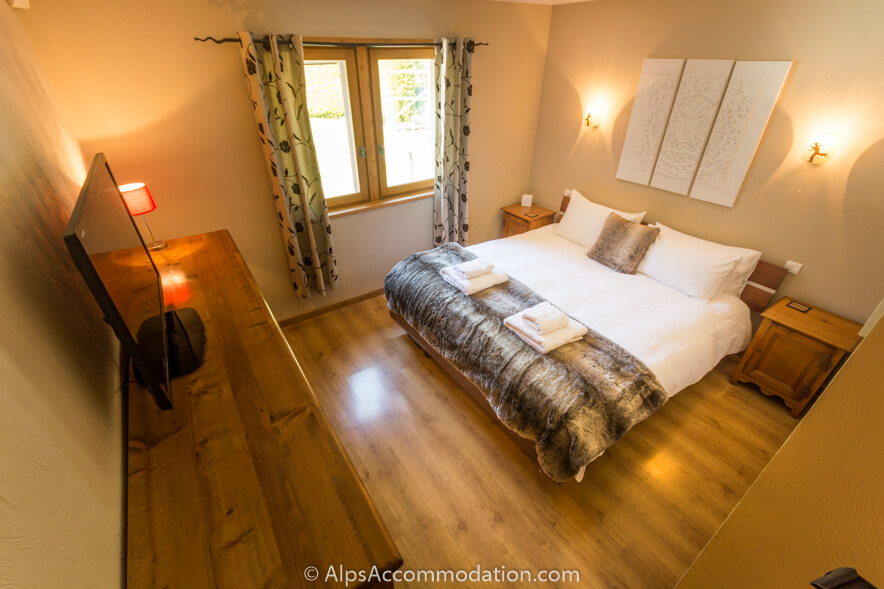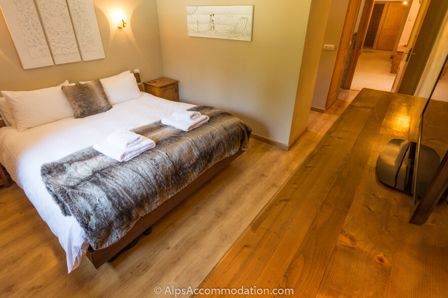 La chambre 4 est une chambre agréable et spacieuse, avec encore un grand lit double de taille « super-king ». La chambre a son propre accès à un balcon exposé à l’est offrant des vues splendides sur le hameau paisible de Vallon d’En Haut et les pics enneigés. Une grande armoire intégrée offre un espace de rangement.