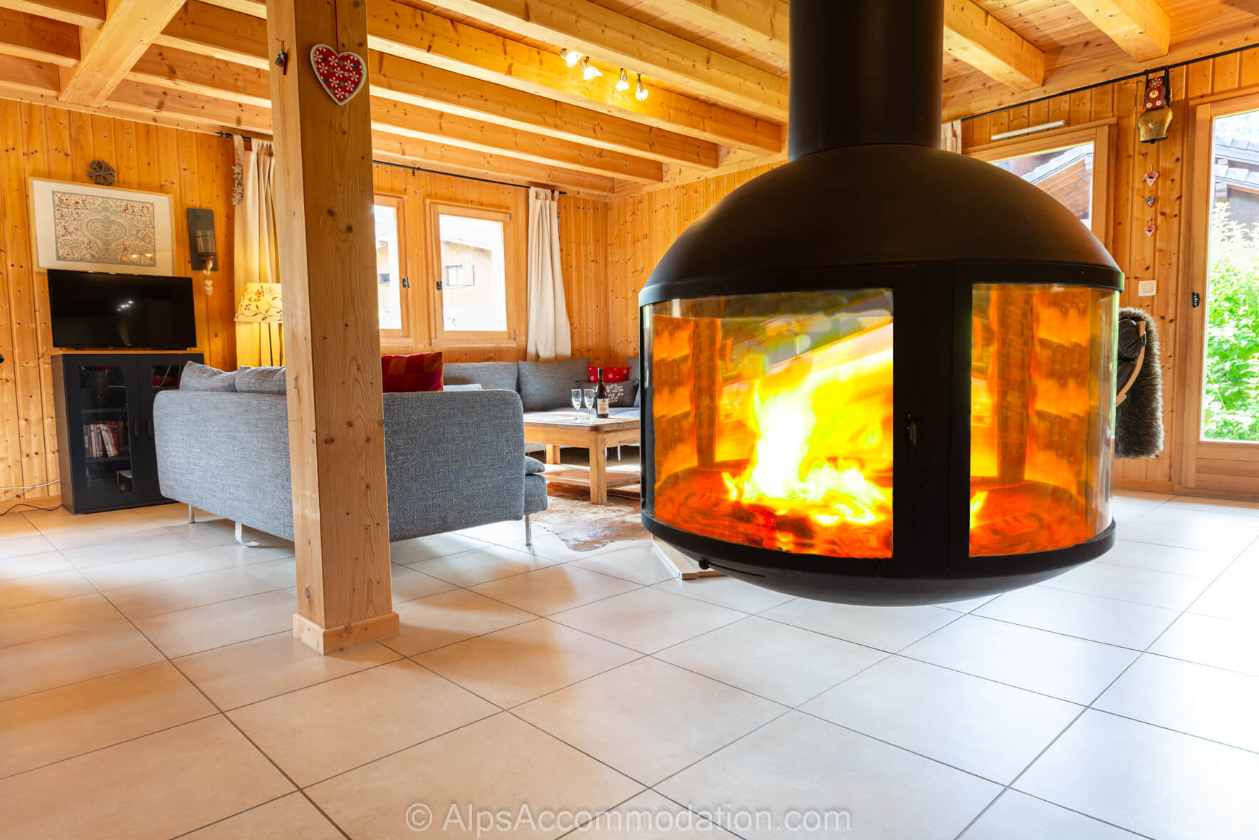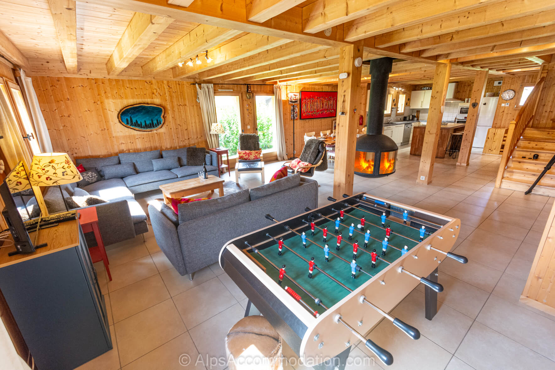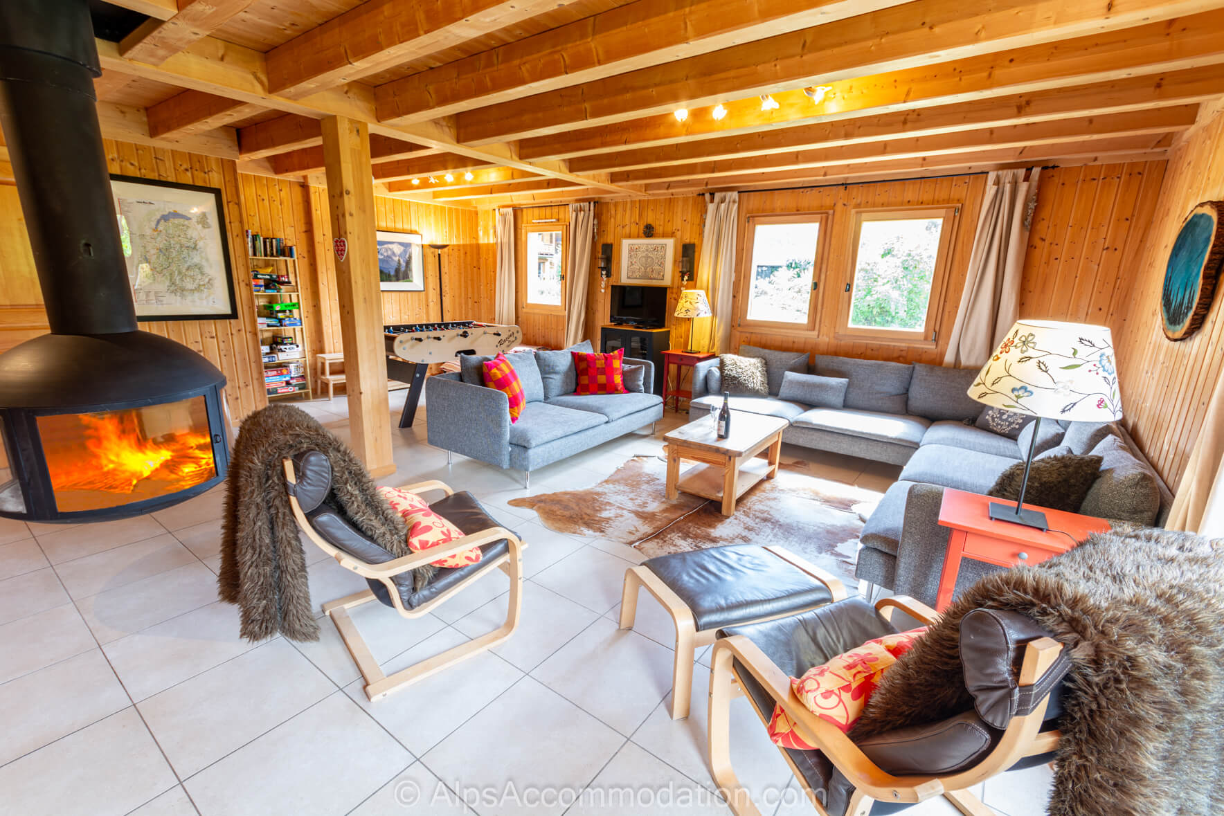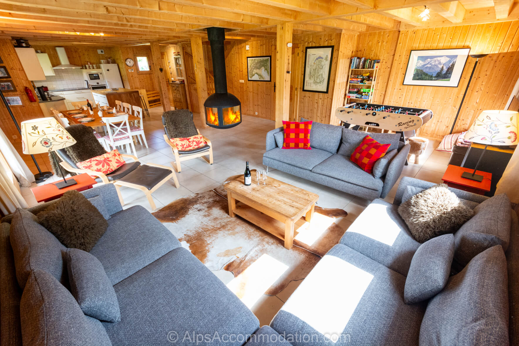 Chalet Esse, Samoens, une maison individuelle, rangée sur 160m2, comprend 4 chambres et 3 salles de bain et peut recevoir 10 personnes en tout confort. Ce chalet possède un salon superbe avec des grands canapés confortables, et une cheminée suspendue, très impressionnante. A côté du salon, la salle des jeux comprend une table à babyfoot et une grande table à ping-pong.