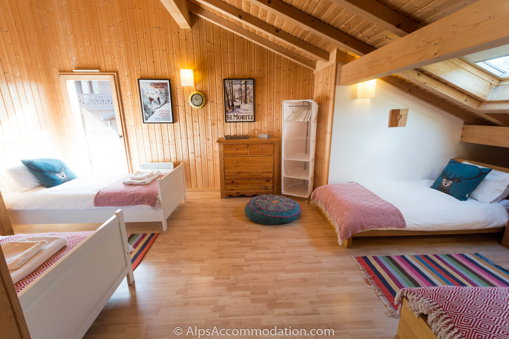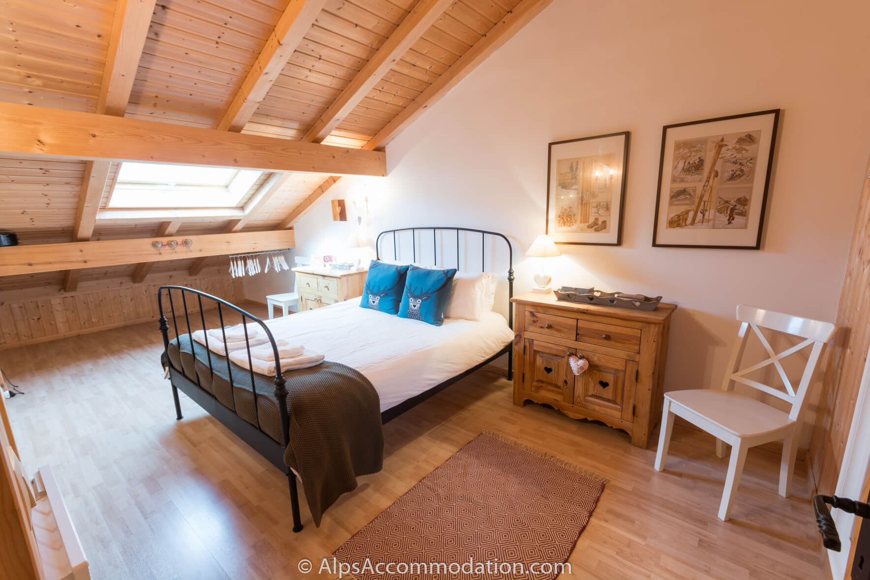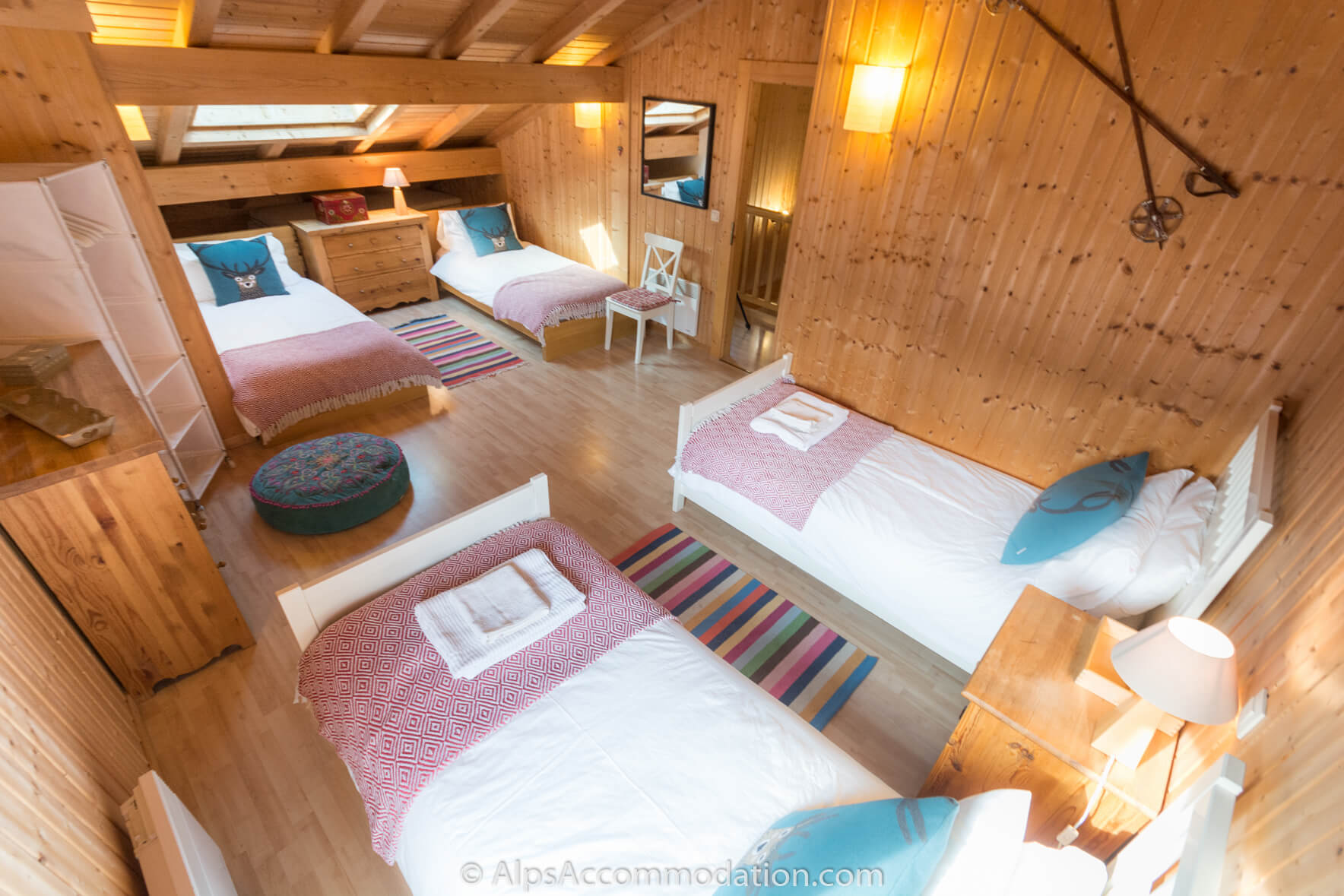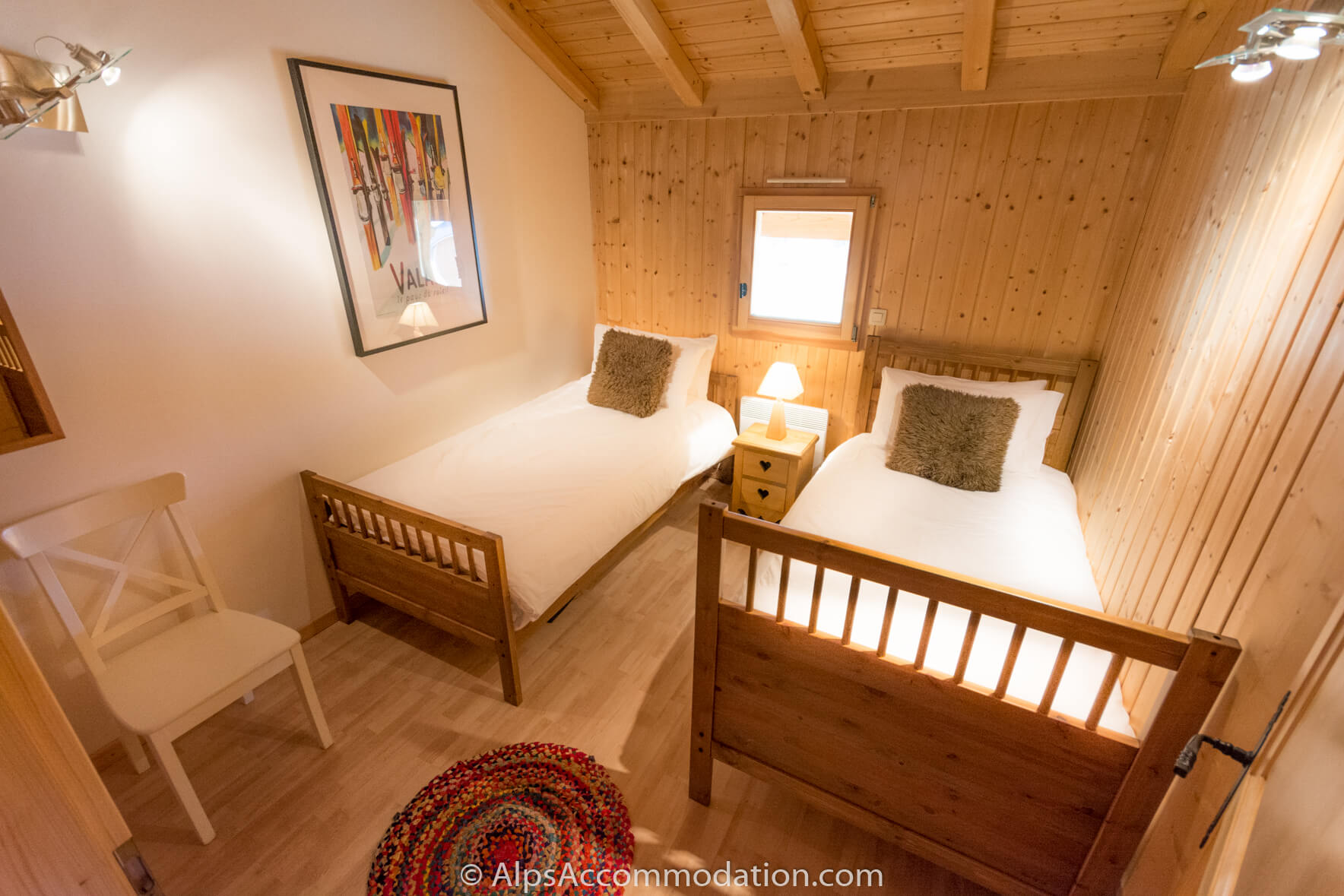 Au second niveau du Chalet Esse on trouve les quatre chambres. La première avec velux dispose d’un grand lit, deux commodes et d’un espace de rangement. La seconde à quatre lits simples et un accès au balcon. La troisième, très grande, dispose d’un grand lit et à accès au balcon côté sud. La quatrième, spacieuse, dispose de deux lits simples. Cet étage possède aussi 2 salles de bain (baignoire-douche, lavabos et WC).
