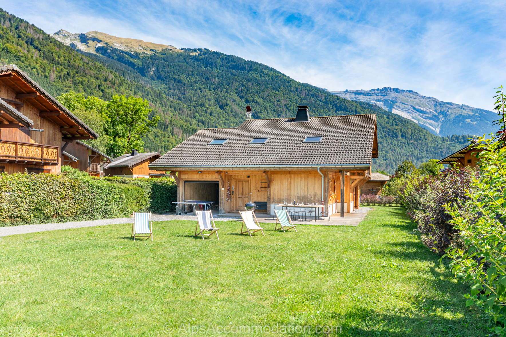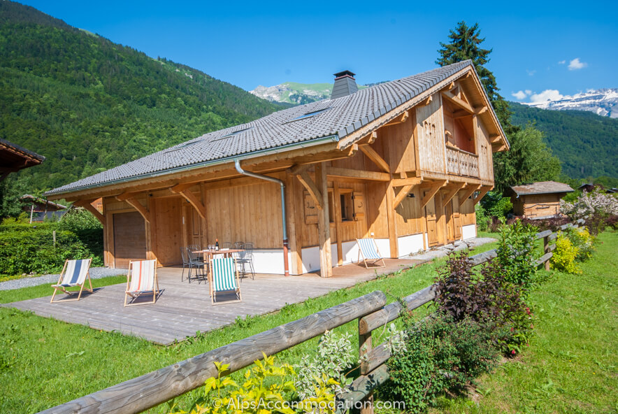 Le chalet est entouré d’un jardin plat et dégagé bien entretenu, avec tables et chaises extérieures pour 10 personnes, chaises longues, et un barbecue. Le balcon au second niveau offer des vues spectaculaires des sommets.