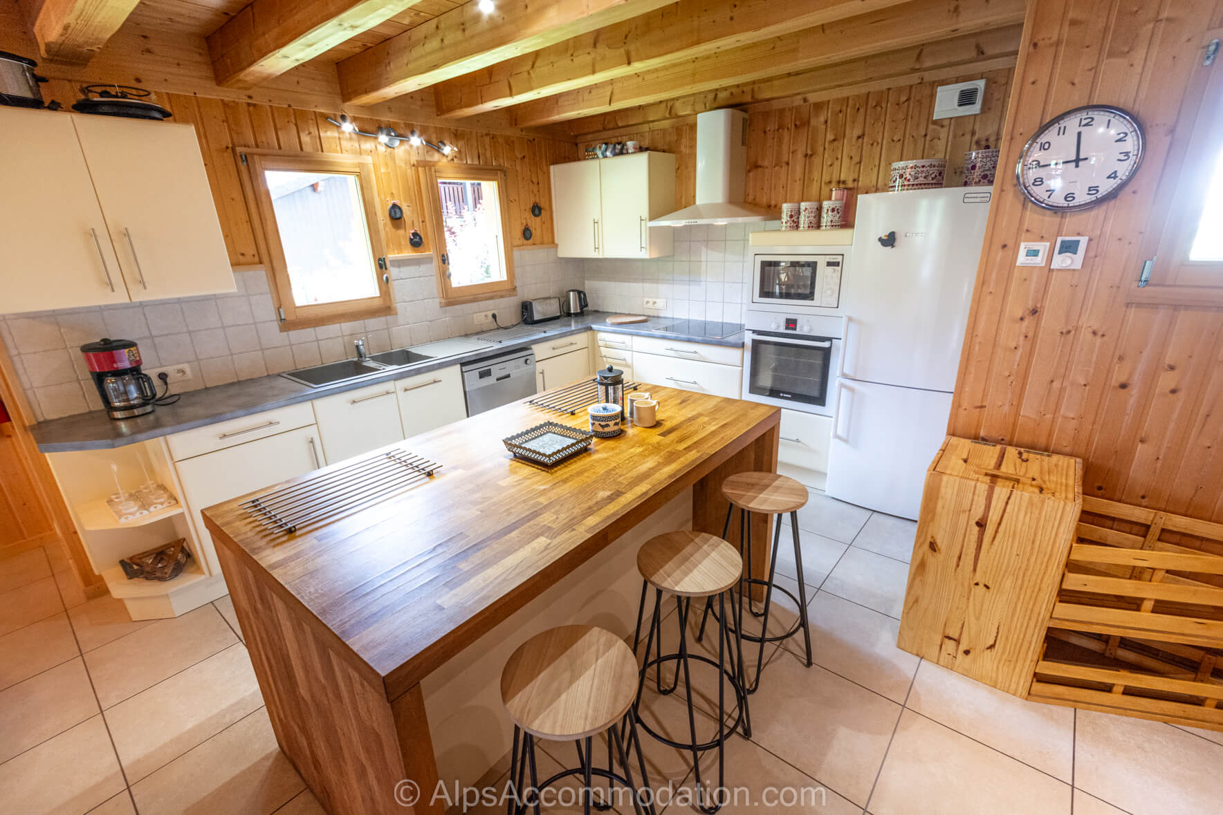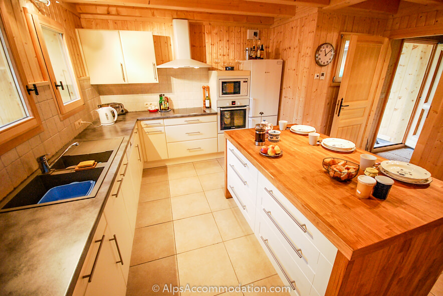 La cuisine moderne est équipée d’un grand frigo-congélateur, d’un lave-vaisselle, d’un four micro-ondes et de grands plans de travail avec ilot central très utile pour des repas rapides ou prendre de petit déjeuner ou le thé. Il y a également 2 appareils à raclette et 2 appareils à fondue.