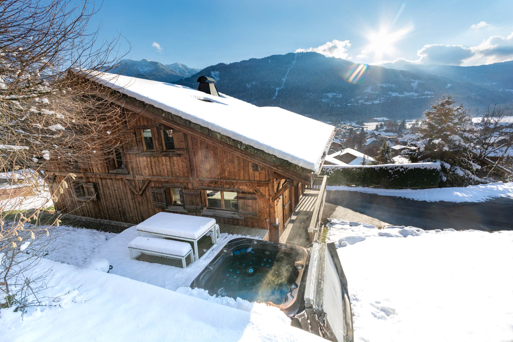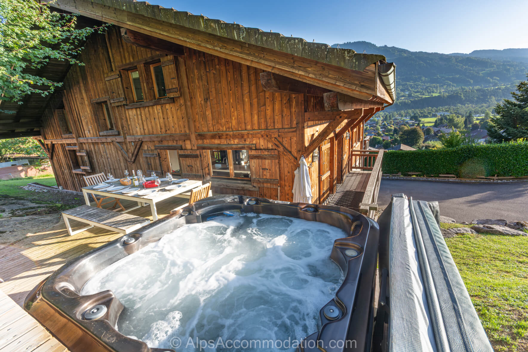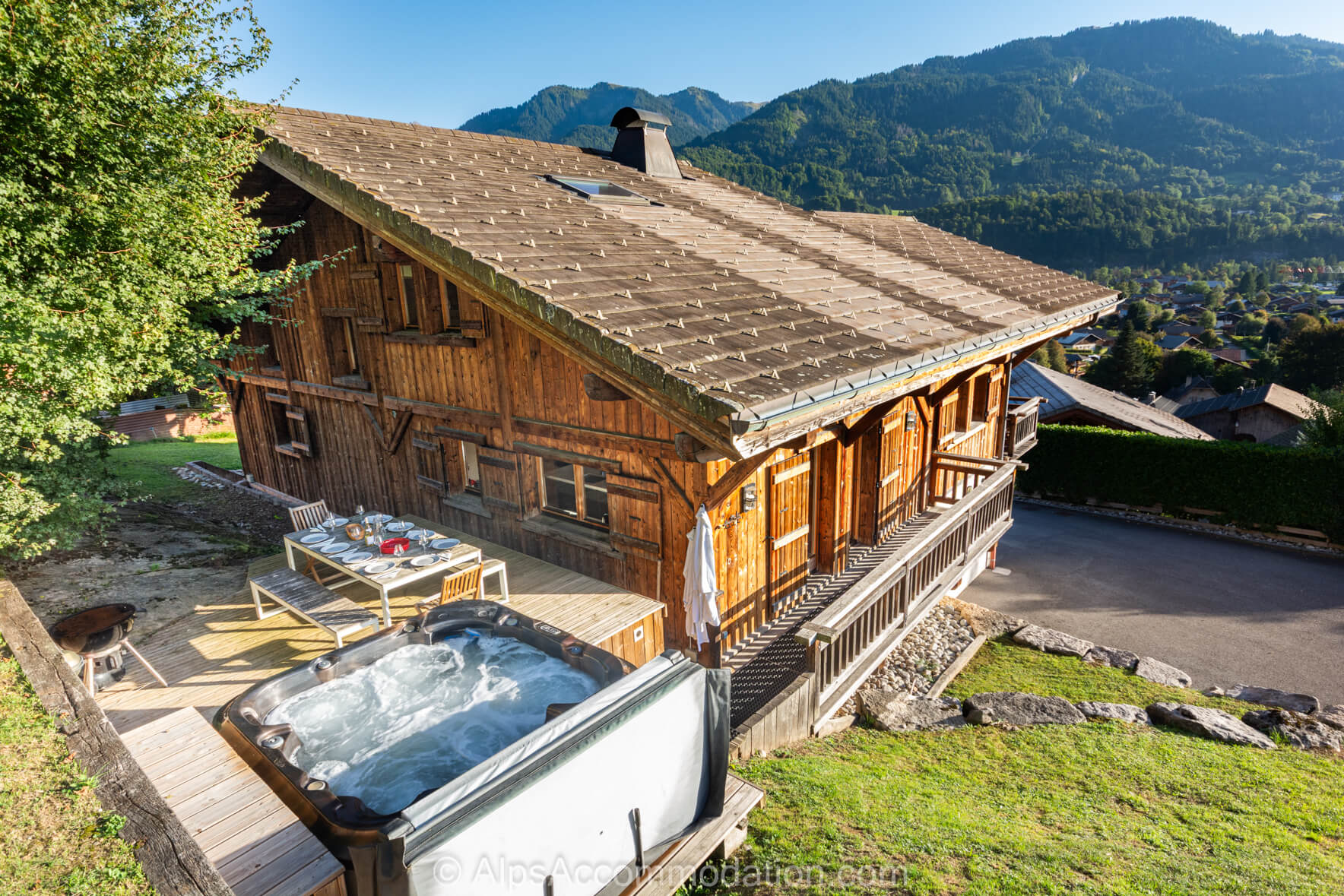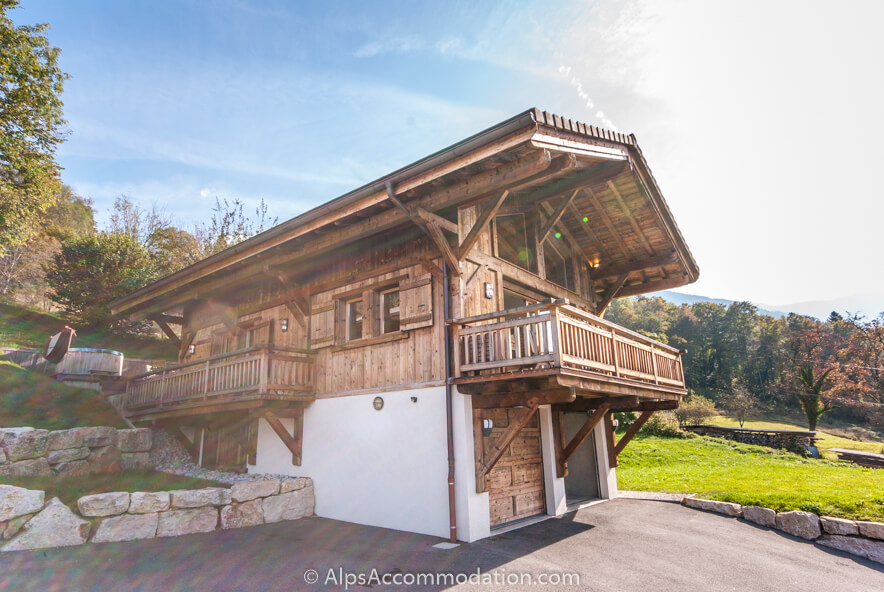 L’extérieur de Chalet Foehn est, comme son intérieur, superbe. Il était construit en 2010 sur un grand lot de terrain et un attrait particulier est l’ espace pelouse situé à coté du bâtiment. Son extérieur unique, en bois « brulée » était construit par les artisans et commerçants du région Grand Massif. Ces deux balcons, versants sud, sont idéalement situés pour prendre un petit café matinale et, après une journée a la montagne, un verre, en admirant le coucher du soleil. Si la température mont, l’espace « decking» a l’arrière du chalet, est ensoleillé et parfait pour manger en plein air. Derrière le chalet vous trouverez un spa merveilleux, agréable pour se reposer et se rafraichir au même temps d’apprécier le coucher du soleil et les vues des montagnes. Devant le chalet, versant sud, l’espace pelouse est parfait, en été, pour se relaxer, et, en hiver, c’est idéal si vous voulez construire un bonhomme de neige ! Le Chalet Foehn est aussi équipé avec un grand BBQ, très utile a toutes les saisons de l’année.