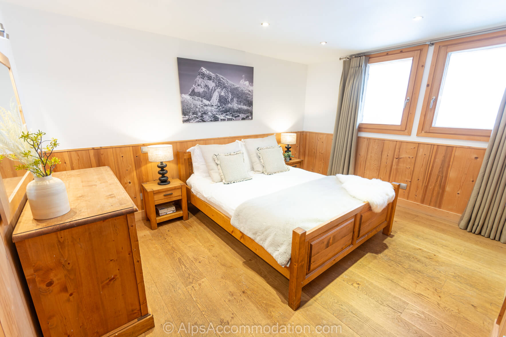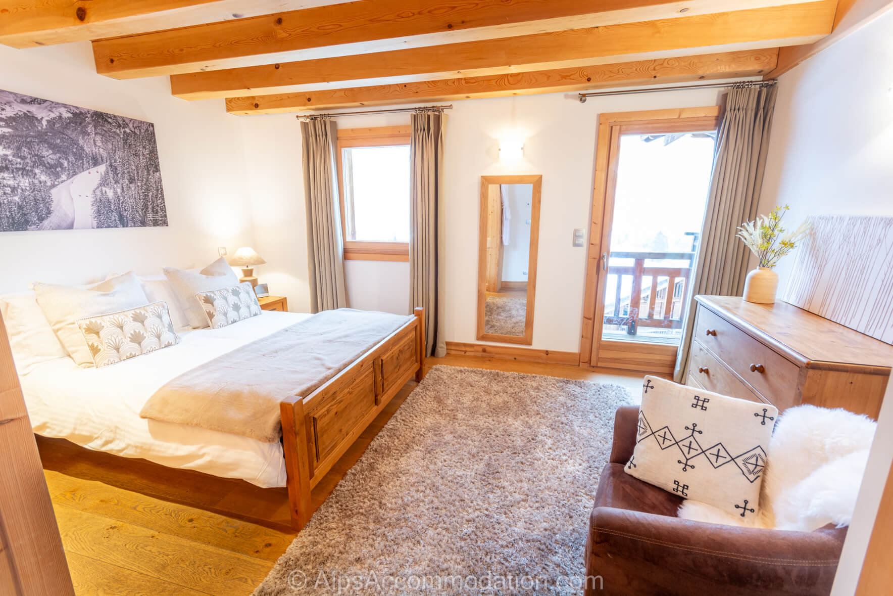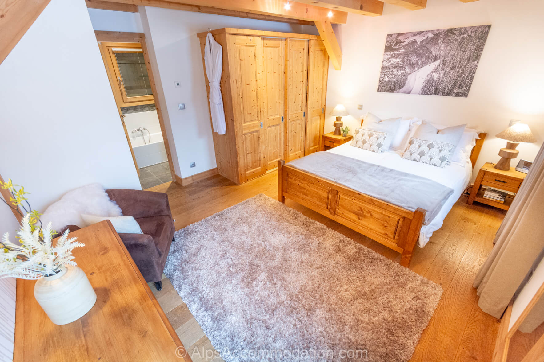 La Chambre No.2 est situe au deuxième étage. C’est une chambre double avec salle de bain. Elle possède un balcon, donnant versant sud sur le village de Samoëns et les montagnes environnantes, parfait pour commencer une journée de sport en regardant le lever du soleil sur les cimes à 3000m! Une grande armoire encastrée permet de tout ranger. La salle de bain comprend une baignoire avec douche intégrée, une douche séparée, un WC, un grand lavabo élégant et un sèche-serviettes.