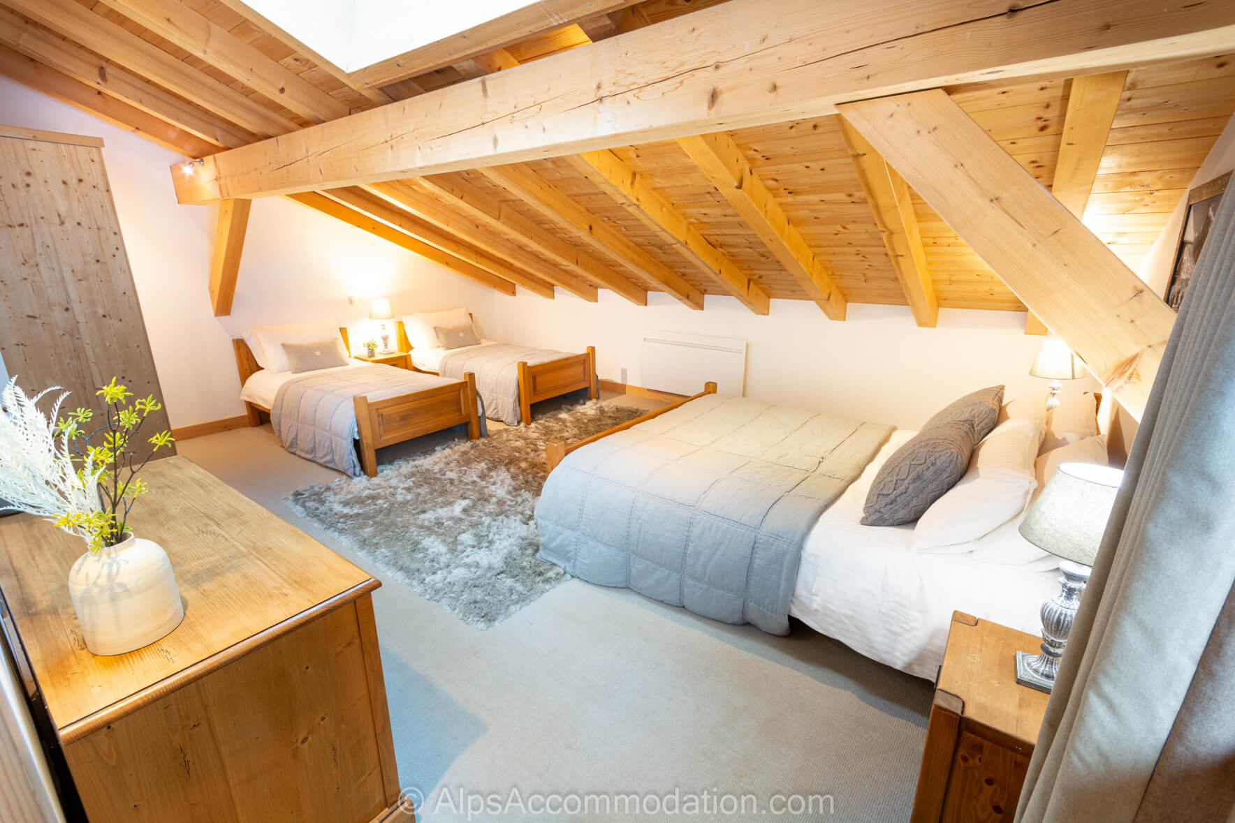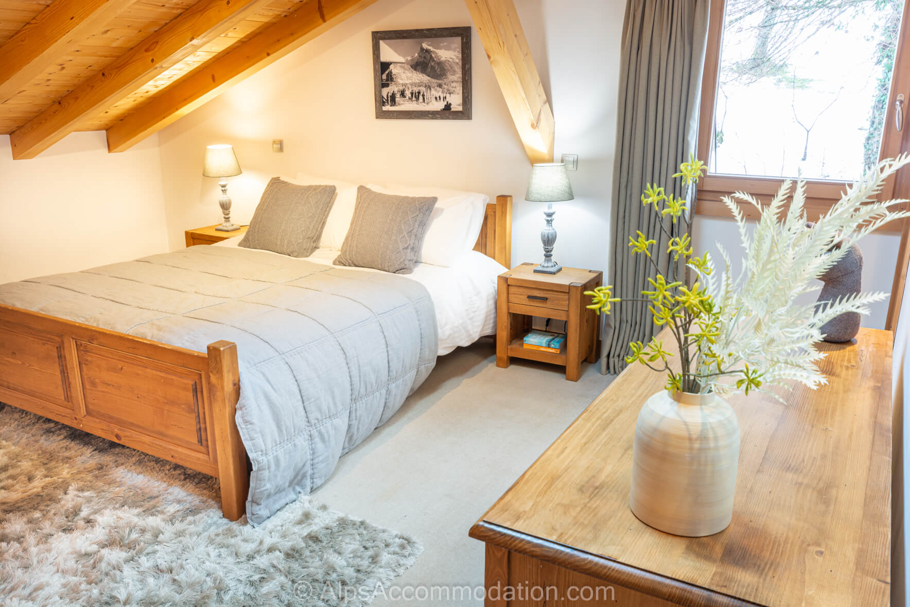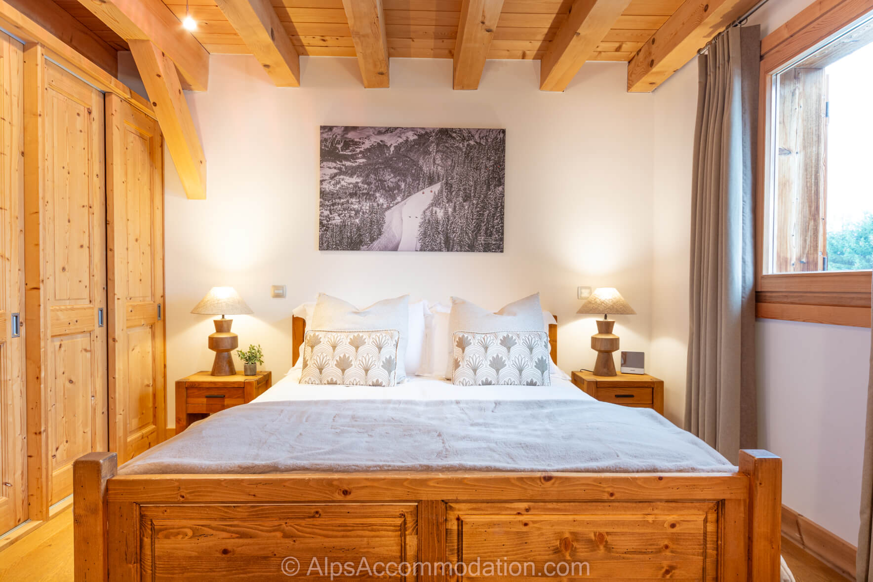 La Chambre No.2 est situe au deuxième étage. C’est une chambre double avec salle de bain. Elle possède un balcon, donnant versant sud sur le village de Samoëns et les montagnes environnantes, parfait pour commencer une journée de sport en regardant le lever du soleil sur les cimes à 3000m! Une grande armoire encastrée permet de tout ranger. La salle de bain comprend une baignoire avec douche intégrée, une douche séparée, un WC, un grand lavabo élégant et un sèche-serviettes.