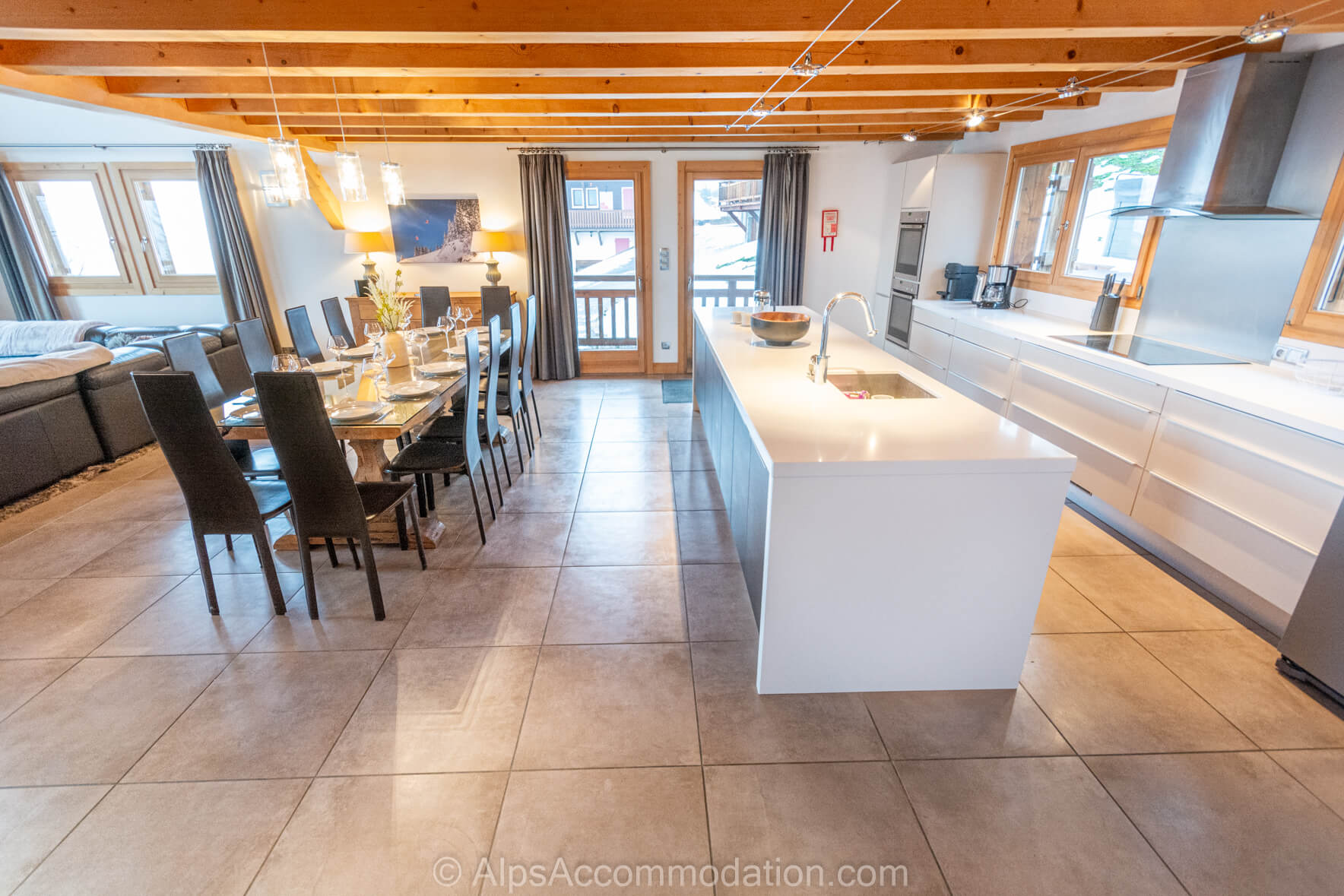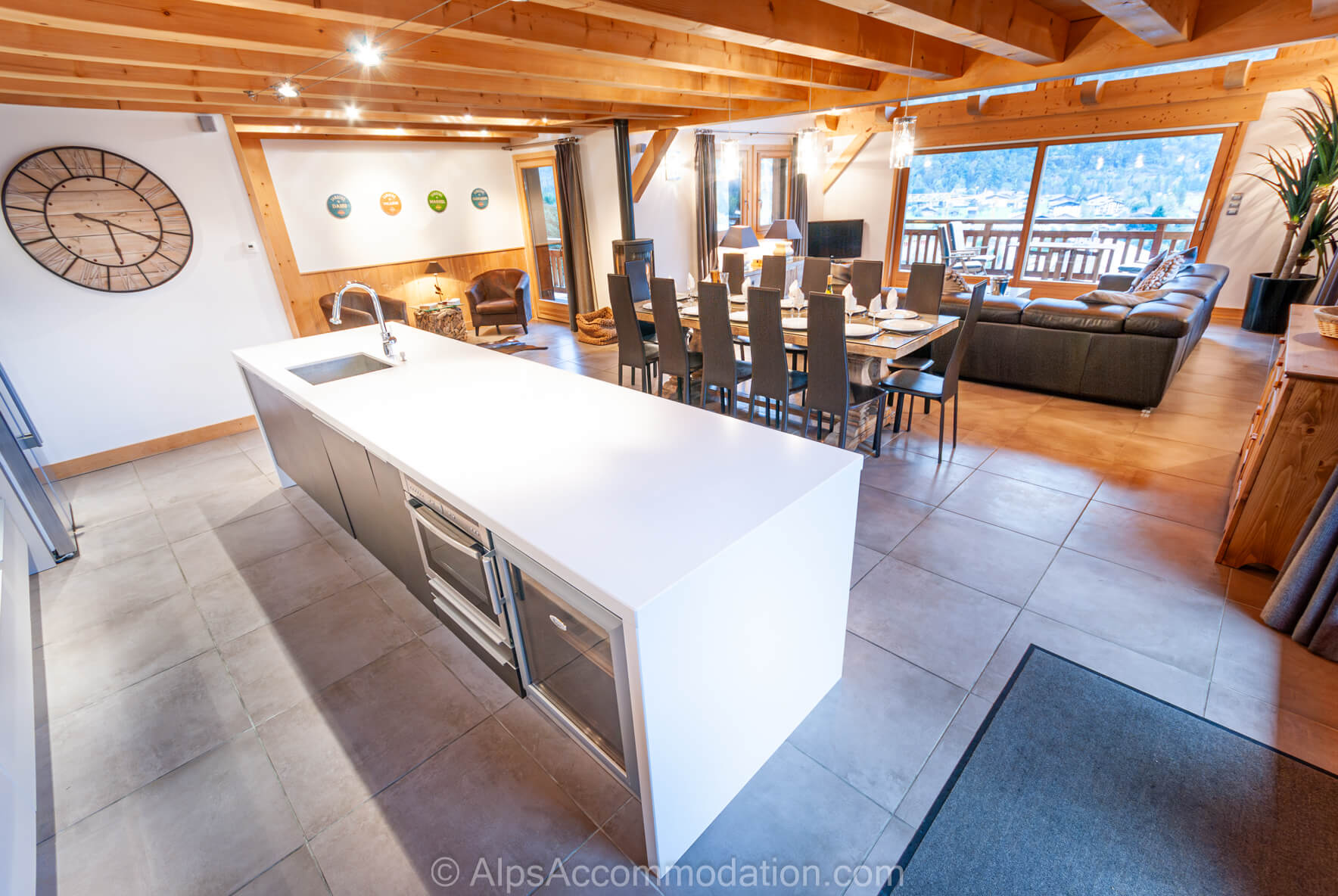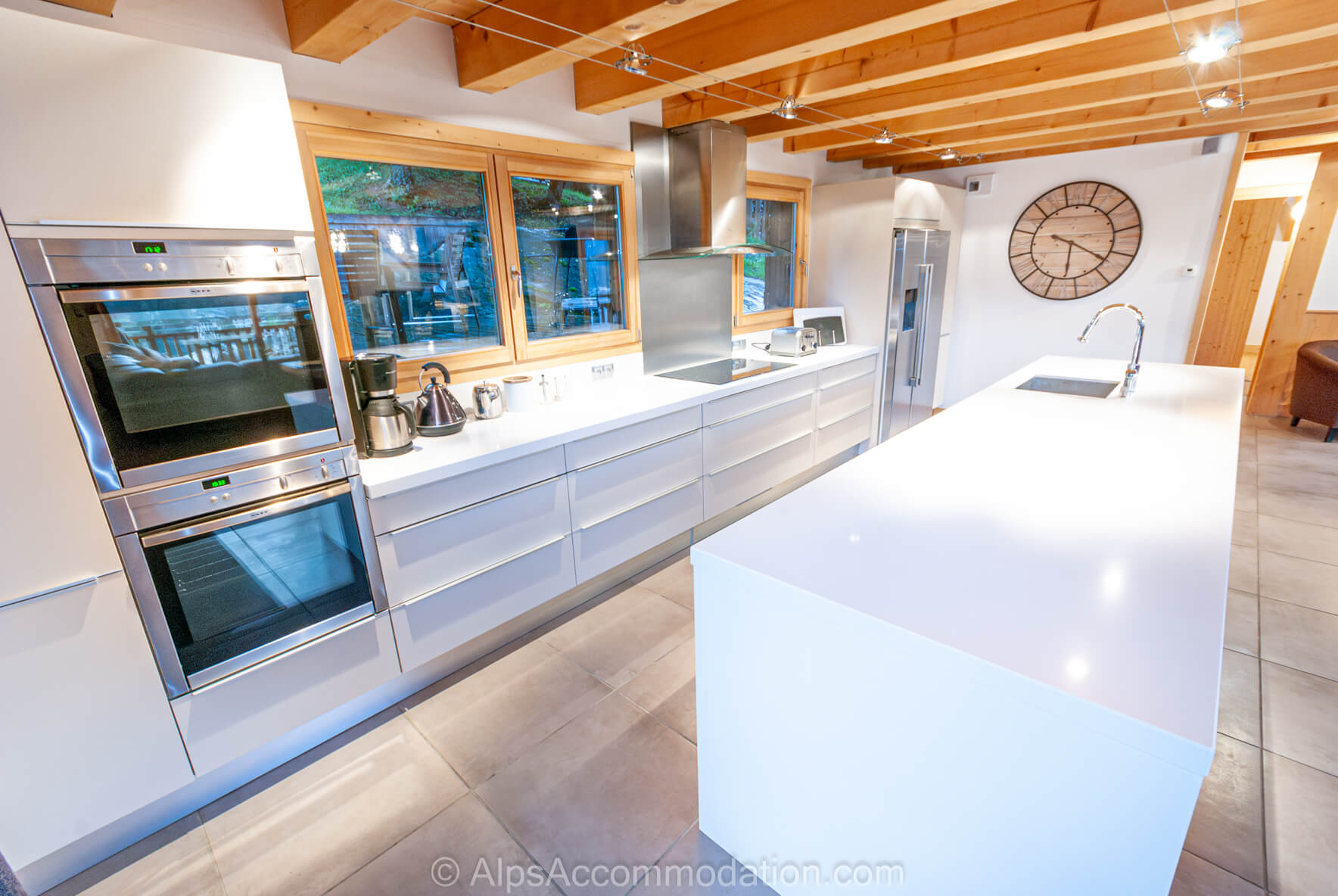 La cuisine luxueuse du Chalet Foehn est peinte en blanc dans un style simple et lumineux, clair et frais, et équipée de grands plans de travail en quartz. Cette cuisine est parfaite pour accueillir de grands groupes. Les propriétaires ont tout fait pour rénover ce chalet avec gout. Par exemple, il y a un distributeur de glaces dans le grand frigo-congélateur américain et deux grands fours, dont un avec micro-ondes et un refroidisseur a vin! Une machine à café, un grille-pain, machines à raclette et fondue, une balance et un robot ménager sont aussi fournis. Un plan de travail au centre de la cuisine est un espace utile pour travailler ou prendre un verre avec le chef. La plaque de cuisine céramique, cinq plaques, est utile pour préparer les repas pour de nombreuses personnes. De cette cuisine, on peut admirer le jardin du chalet et une porte-fenêtre permet d’accéder a la terrasse, idéale pour vos repas a l’extérieur.