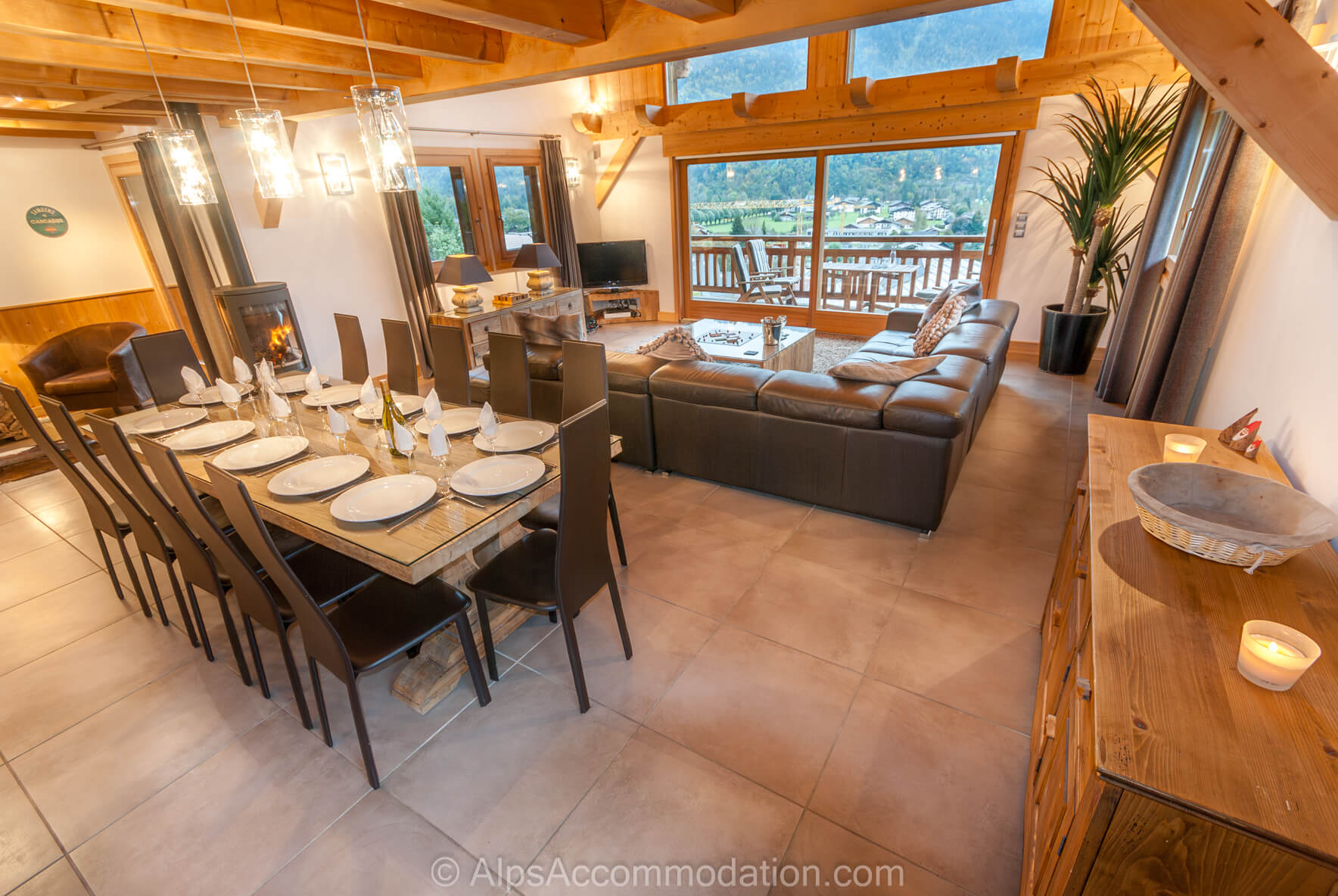 Au deuxième étage, on trouve l’espace séjour ouvert de 60m comprenant le salon, la cuisine et la salle à manger, décoré dans un style chic-alpin. L’espace cuisine est superbe avec une grande table, très élégante, et un canapé géant devant les grandes fenêtres, pour admirer la vue extraordinaire sur les montagnes les plus impressionnantes de la Vallée : La Cathédrale, Le Mont Buet, Marcelly et Le Criou. Si vous pouvez abandonner cette vue magnifique, allez ouvrir une bonne bouteille et allez vous installer dans l’espace salon, devant la cheminée a bois.. Ce chalet vous offre un grand canapé confortable, en cuir, devant une télévision satellite LCD. La table en bois et en verre réfléchit la lumière de la suspension, donc, cet espace est très convivial pour prendre un petit déjeuner, ou un diner avec amis.