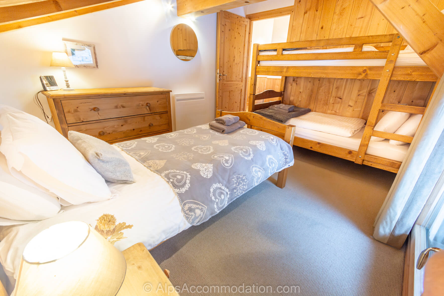 Les chambres Nos 3, 4, et 5 sont situées au troisième étage. La Chambre No 3, pour trois personnes comprend deux grands lits superposes et un lit séparé et une grande commode rustique. A coté on trouve la Chambre No 4, une chambre double avec une grande armoire encastrée éclairée, par une grande fenêtre, avec des vues superbes sur Samoëns et sur les pistes. Ces 4 chambres partagent une grande salle de bain familiale, équipée avec une grande douche et lavabo, et un WC séparé. Chambre No 5 est une grande chambre familiale avec un grand lit, et deux lits séparés. Il y a aussi un lit pliant est disponible, selon vos besoins. La salle de bain privee est équipée d’une douche, d’un lavabo élégant et d’un WC.