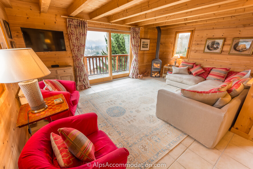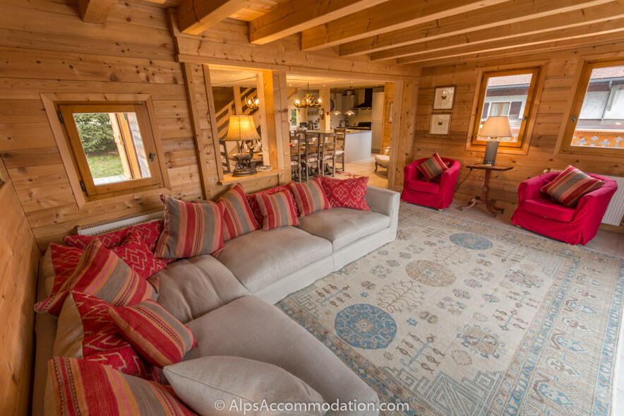 Le salon offre un confort superbe et une vue extraordinaire, grâce à sa situation élevée. Cet espace ensoleillé et lumineux est un endroit relaxant après une journée passer à la montagne. Les clients peuvent se détendre dans le sofa en coin ou dans les deux fauteuils aux couleurs vives, et oublier leur fatigue devant le poêle a buches qui réchauffe la pièce. Il y a aussi un coin tranquille avec une lampe pour s’installer au côté du salon. Un grand téléviseur LCD avec récepteur satellite et un IPad dock sont disponibles dans le salon ainsi que le Wi-Fi gratuit.