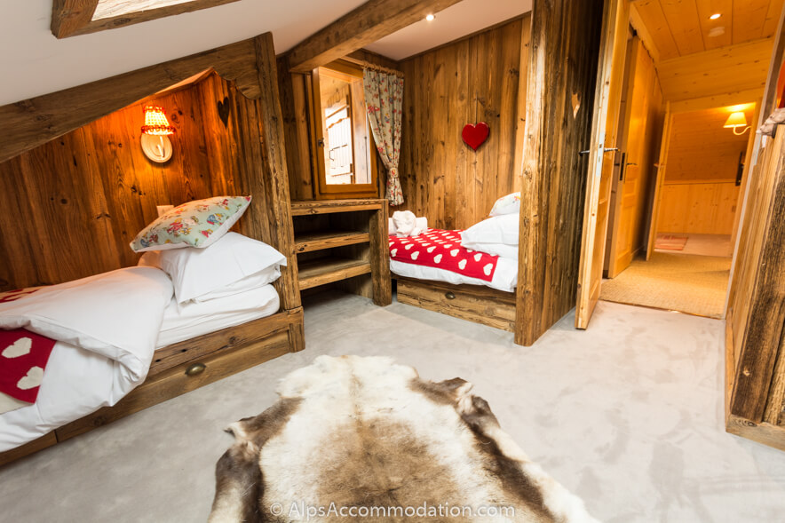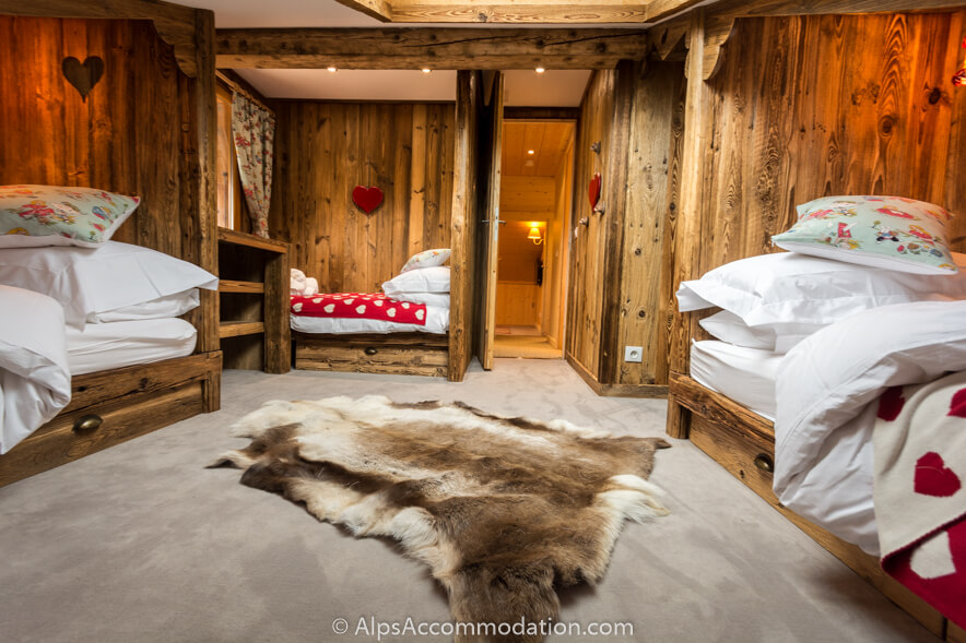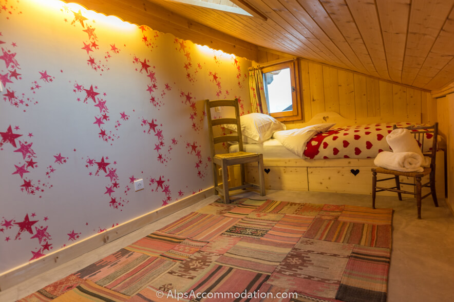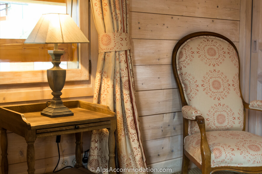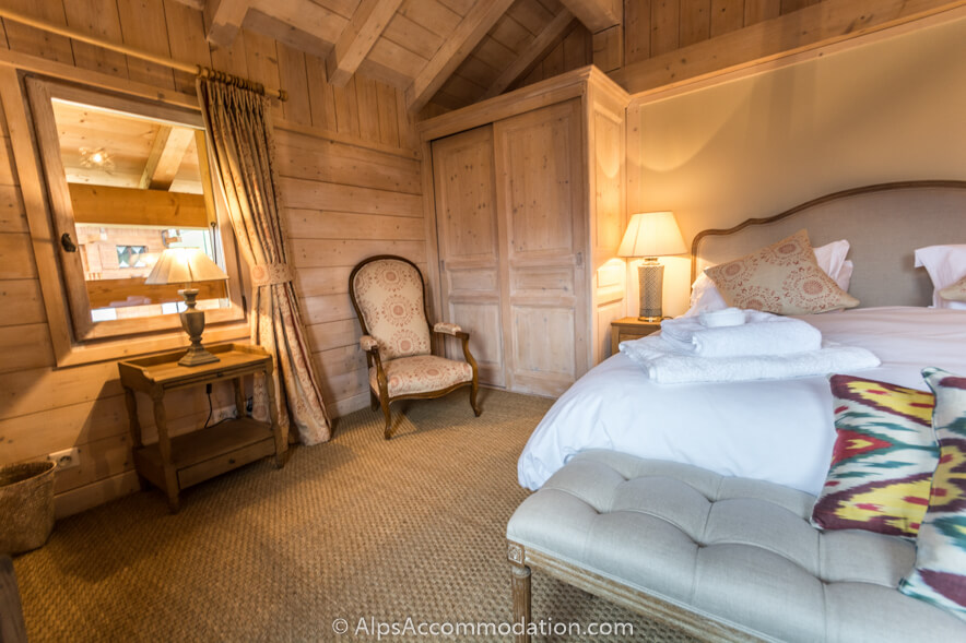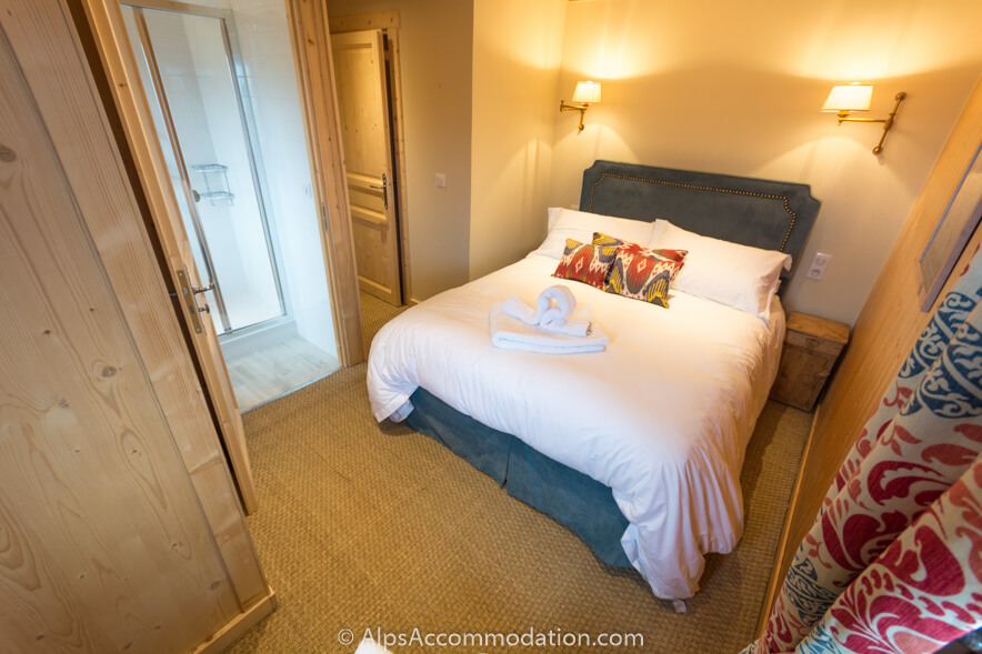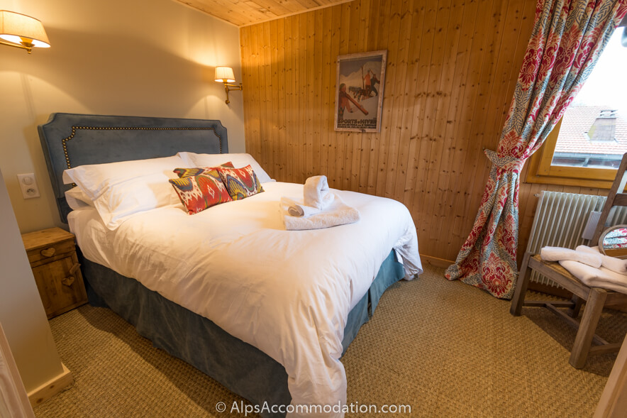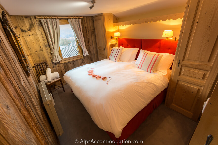 La chambre 4 est charmante, avec ses murs et placards recouverts de bois rustique. Les propriétaires ont choisi une décoration savoyarde de qualité pour créer une atmosphère de luxe alpin, très accueillante mais pratique avec ses grands placards. La fenêtre, versant sud, de cette chambre offre une vue fantastique sur le village historique.