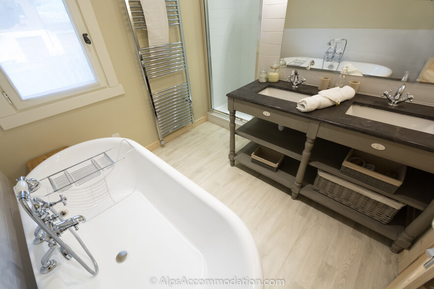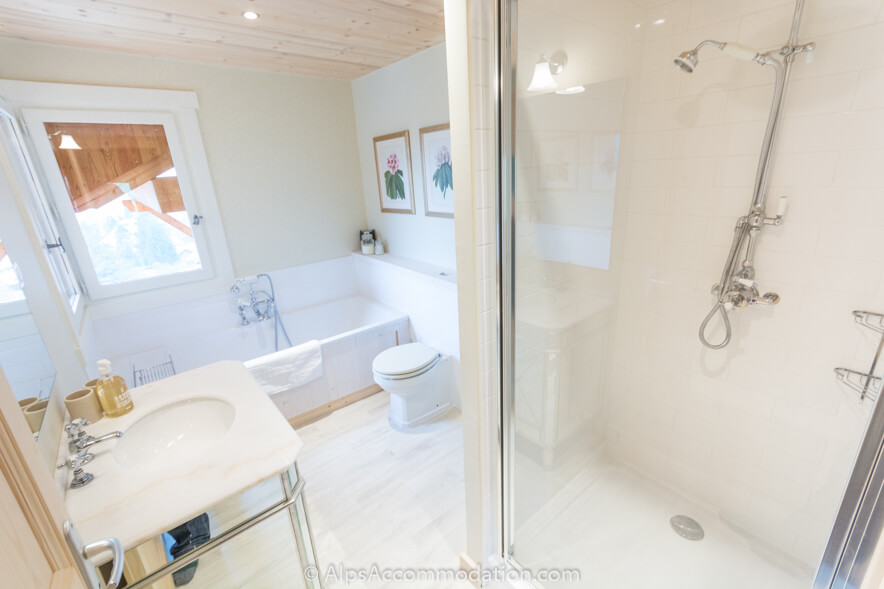 Une salle de bain familiale est aussi située au deuxième étage du chalet. Elle est équipée d’une baignoire, style années 90, d’une grande douche, d’un lavabo avec vanity, d’un sèche-serviettes chauffé, et d’un wc.