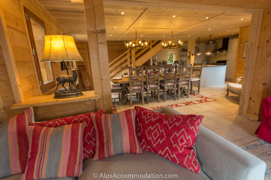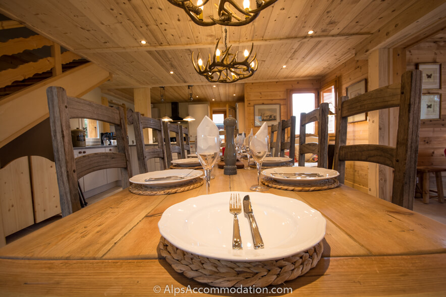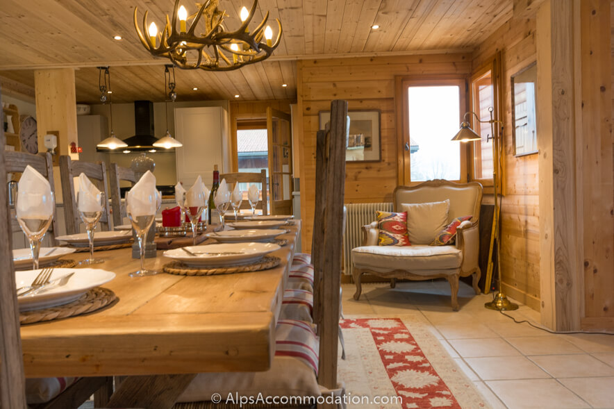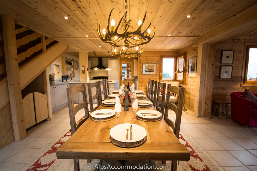 De la cuisine, on accède à la salle à manger, impressionnante, avec sa longue table en bois, et une paire des beaux lustres en bois de cerf. Cette grande pièce peut recevoir 10/12 personnes en tout confort, avec son poêle à buches et ses portes- fenêtres qui donnent sur les terrasses et offrent une vue superbe.