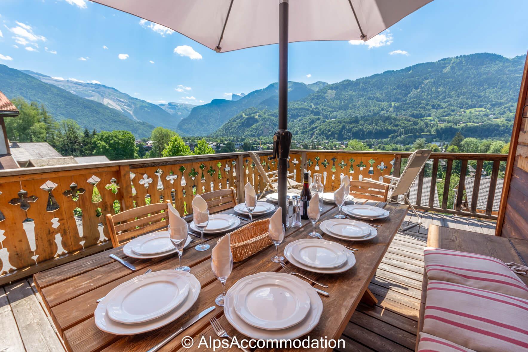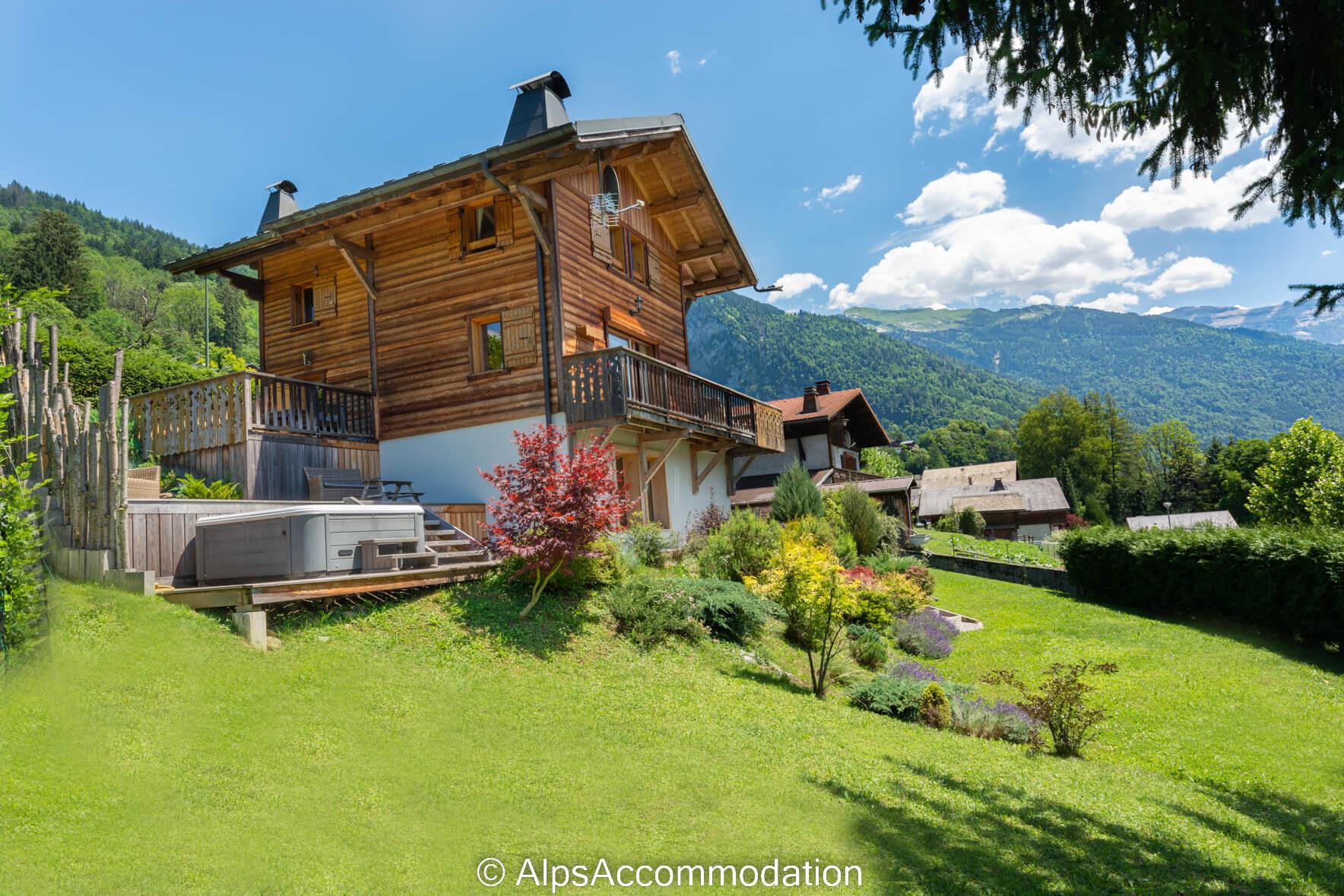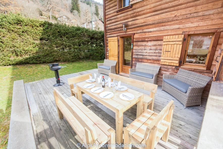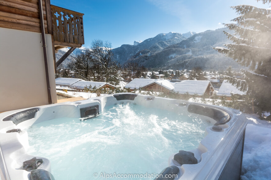 Le chalet à deux grandes terrasse, et un spa luxueux ; la première de 20m2, donne sur le versant sud et est un endroit fabuleux pour manger à l’extérieur dans un cadre extraordinaire. La seconde, qui donne sur le versant sud et ouest, est ensoleillée l’après-midi, et elle offre un endroit pour se protéger de la chaleur de l’été. Une grande pelouse se trouve en contre-bas.