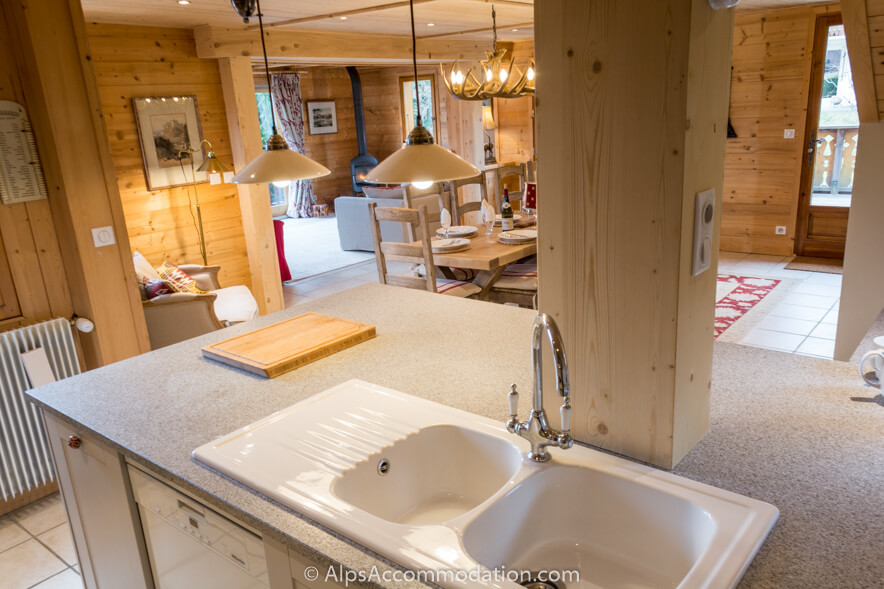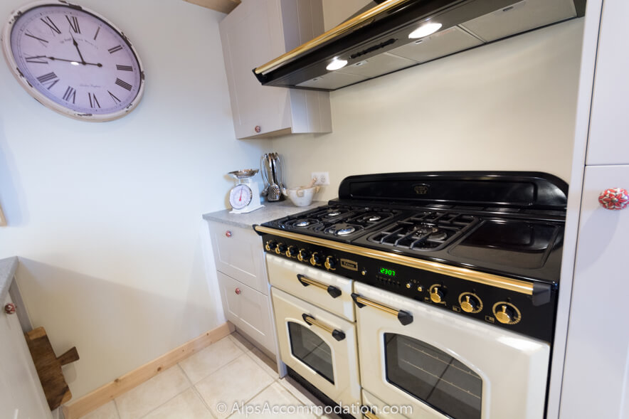 La cuisine fabuleuse, style ferme de savoie, possède un équipement superbe. La cuisinière Falcon, avec ses deux fours et son grill séparé, est idéale pour la préparation facile des repas délicieux. La cuisine comprend aussi un grand réfrigérateur/congélateur, un second réfrigérateur et congélateur, un lave-vaisselle, une machine à café « Dolce Gusto ». L’ilot offre un grand espace de travail ainsi que le rangement pour les appareils ménagers comme la raclette pour les soirées conviviales.