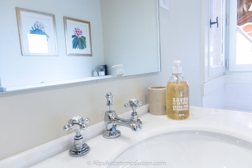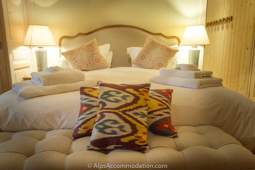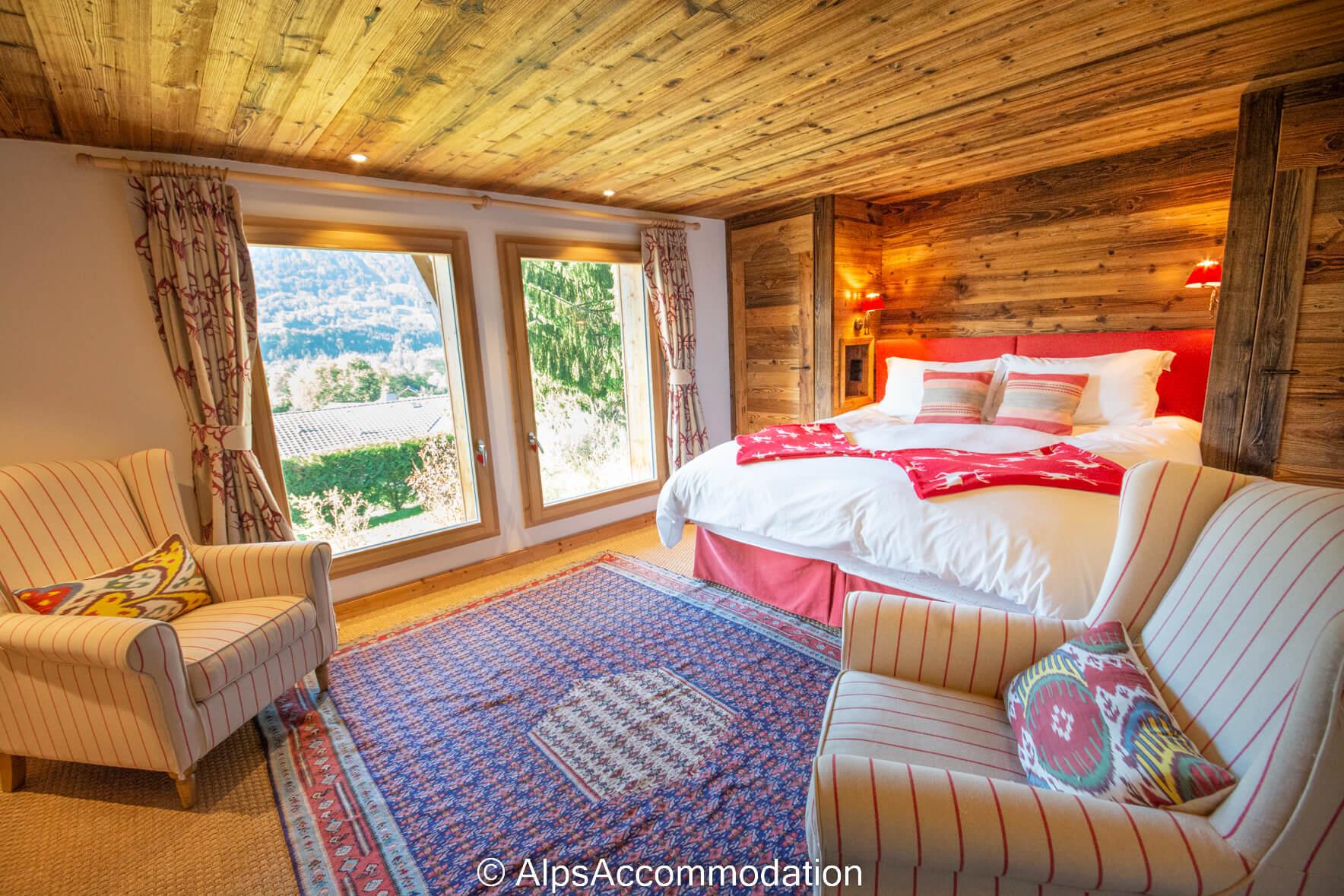 La chambre 1, principale, au deuxième étage de la propriété, est magnifique avec sa salle de bain et wc privé. En entrant dans la chambre par son couloir privé la vue étonnante sur Samoëns visible aussi du lit luxueux vous impressionnera. Ce lit, au centre de la chambre, sous le plafond a double hauteur, est embelli par un linge de maison superbe et la lumière d’ une belle lampe suspendue. Trois placards intégrés offrent beaucoup de place pour ranger les affaires. La salle de bain est équipée d’une baignoire, style années 90, et deux lavabos, avec leurs robinets élégants chromes, une grande douche. Le wc est séparé.