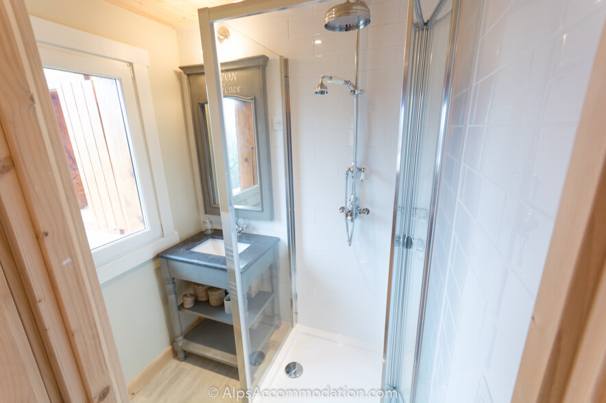 La chambre 6, au sous-sol du chalet, est lumineuse et spacieuse. On accède à son entrée privée par un escalier extérieur. Cette chambre est disponible avec un grand double (super king) ou 2 lits simples. La salle de bain est équipée d’une douche, d’une baignoire, d’un lavabo et d’un wc.