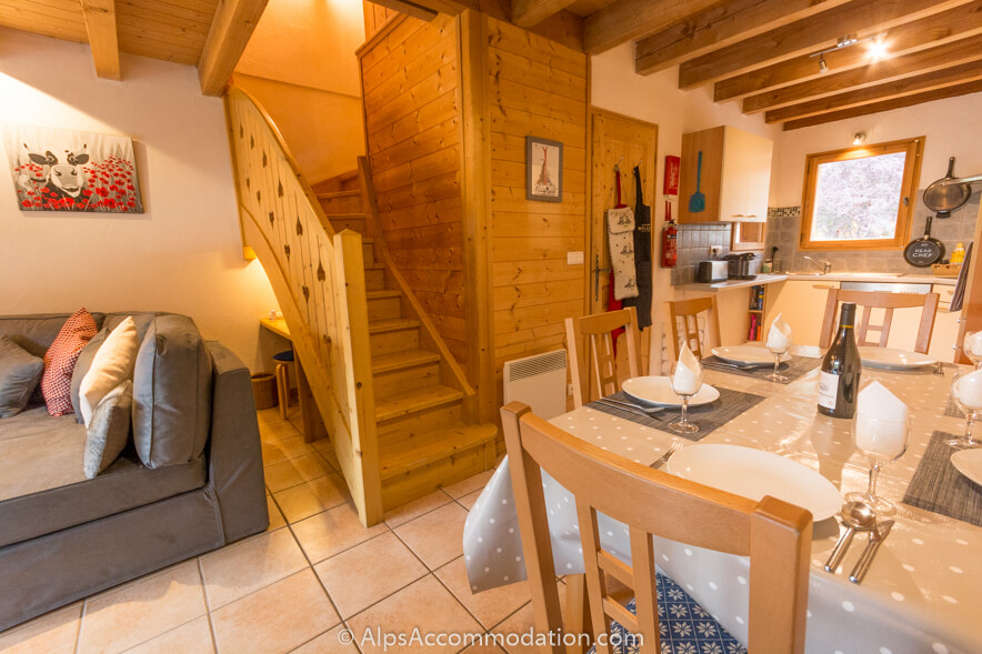 Le chalet est dans une terrasse de quatre ensemble entre autres bâtiments typiquement savoyards à la fin d'un cul-de-sac. 7 minutes à pied plat vous amène au centre du village avec ses nombreux restaurants, boutiques et bars. Le ski-bus est à 2 minutes du chalet - en cours d'exécution toutes les 15 minutes aux heures de pointe. Vous pouvez marchez à la télécabine en 12 minutes et une consigne gratuite pour le matériel de ski en haut ou en bas de la télécabine Grand Massif Express est disponible par nos magasins partenaires. Le cœur du chalet est un feu de bois entouré de sièges confortables pour tout le monde.