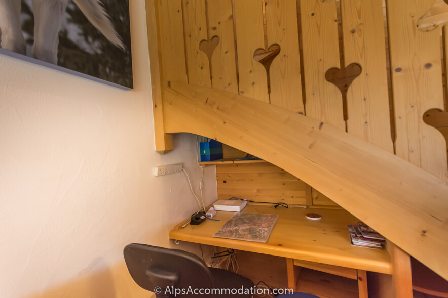 L’espace bureau est fourni avec table, chaise et un canopé-lit confortable. Une séche-cheveux et un feu à répasser sont aussi fournis.