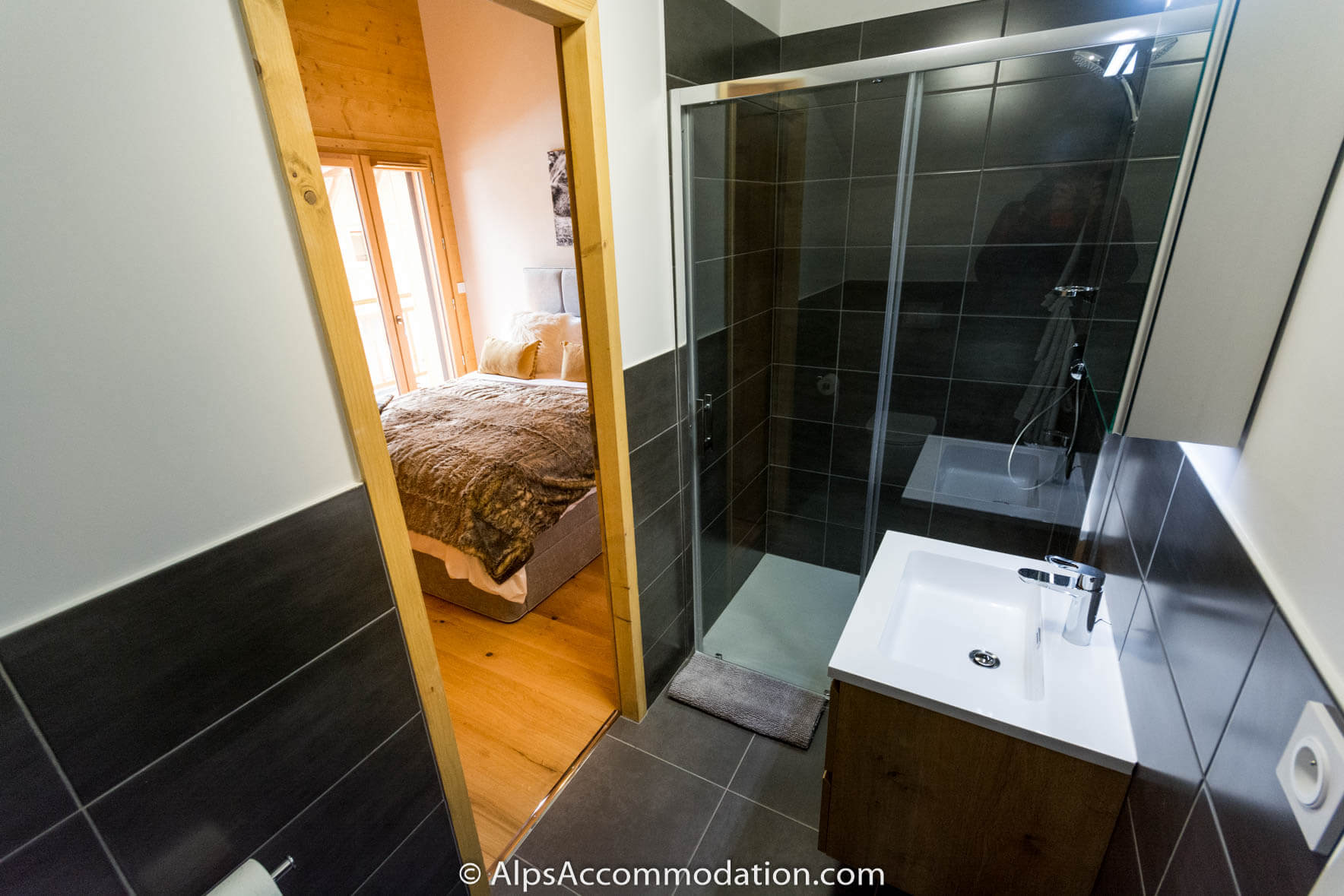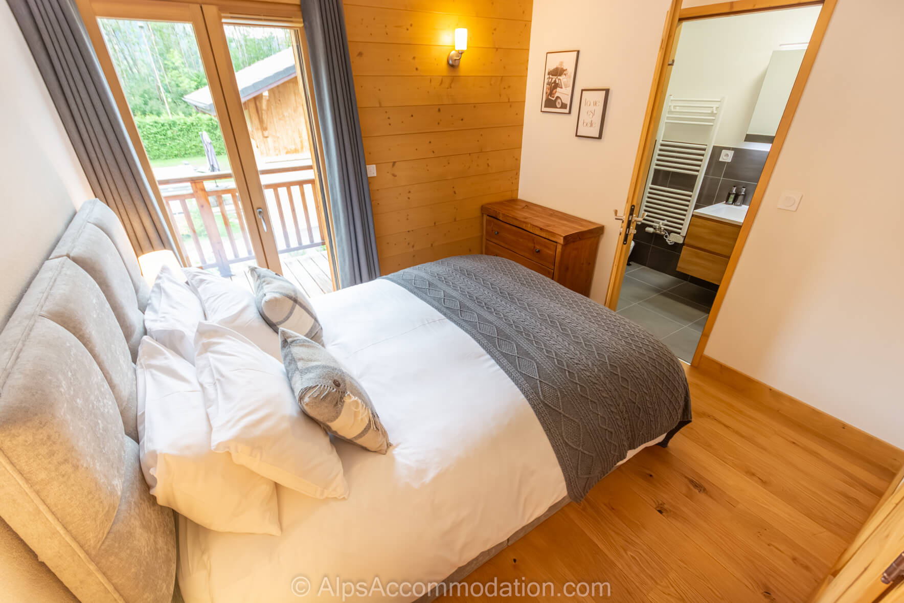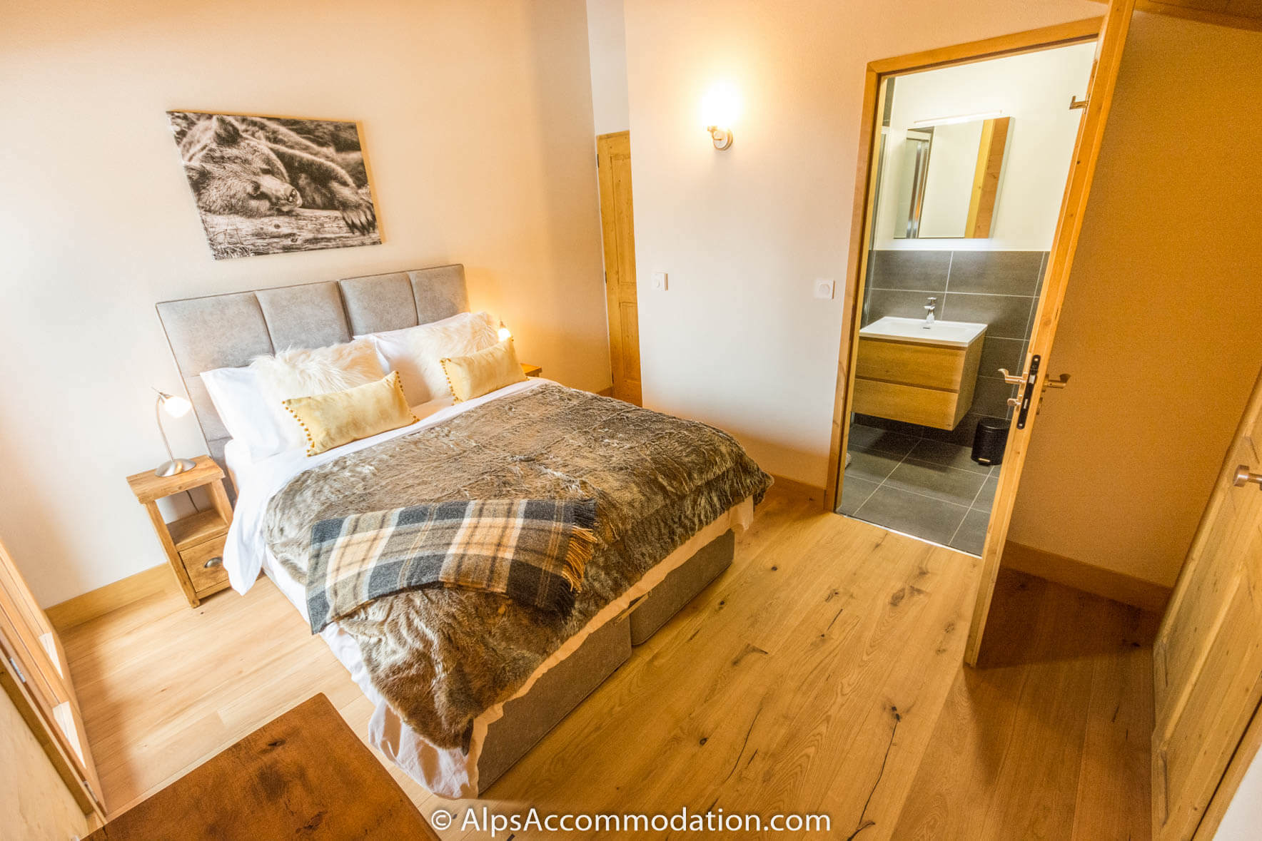 La chambre 1 offre le summum du luxe et comprend un immense lit king size (180 cm) et une salle de bain attenante avec double vasque, baignoire, grande douche à l'italienne, WC et radiateur sèche-serviettes. Deux portes orientées au sud offrent de superbes vues et baignent la pièce de lumière, tandis que deux armoires encastrées et une commode offrent un excellent rangement.