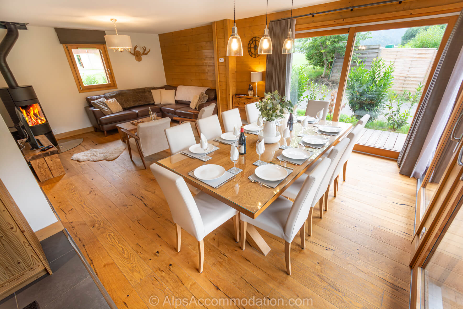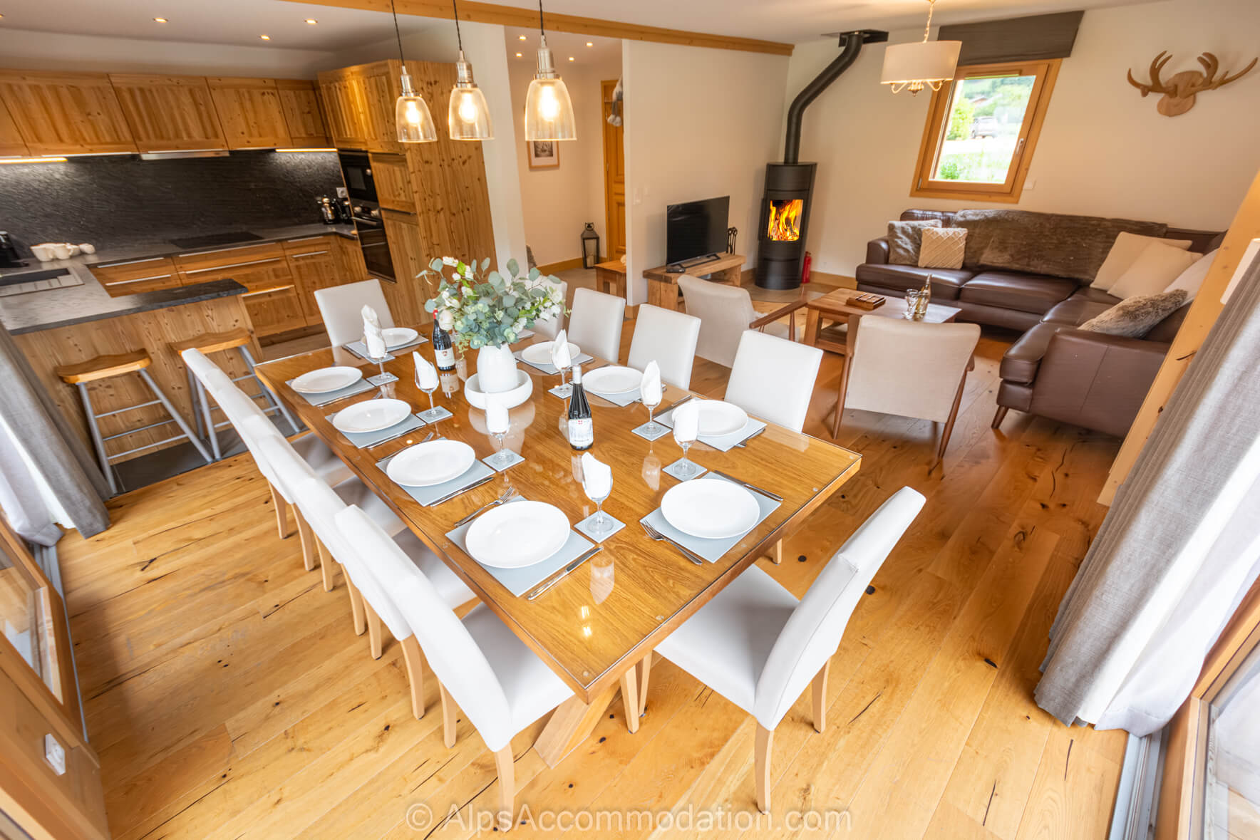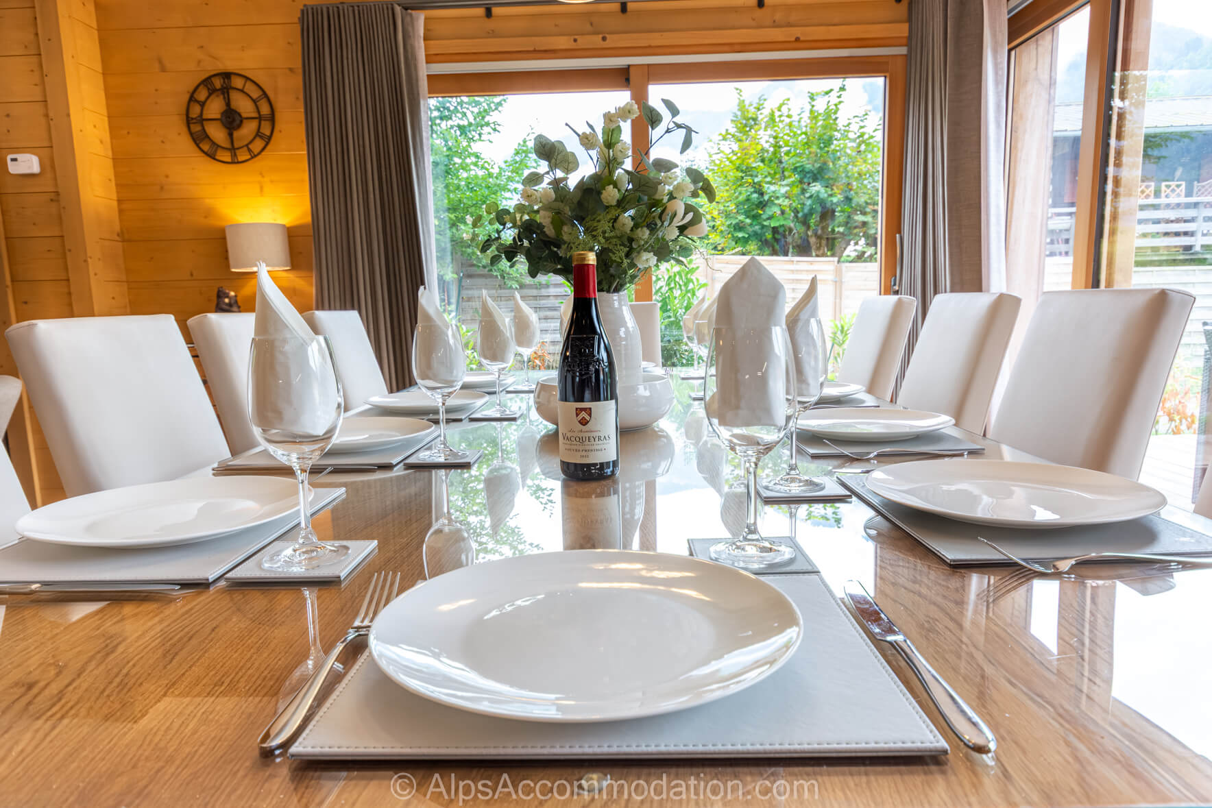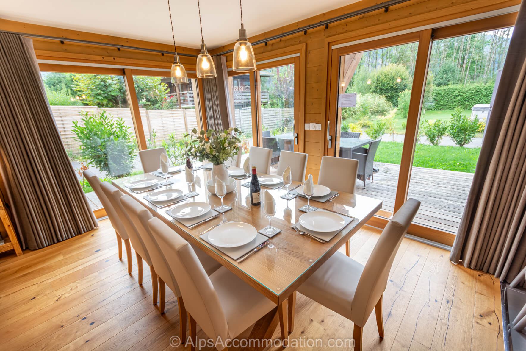 En face de cet imposant espace, la salle à manger est positionnée devant plusieurs portes vitrées offrant une vue fantastique sur les jardins et les montagnes environnantes. Un endroit superbe pour les repas en famille et entre amis pendant que les flocons font leur magie dehors !