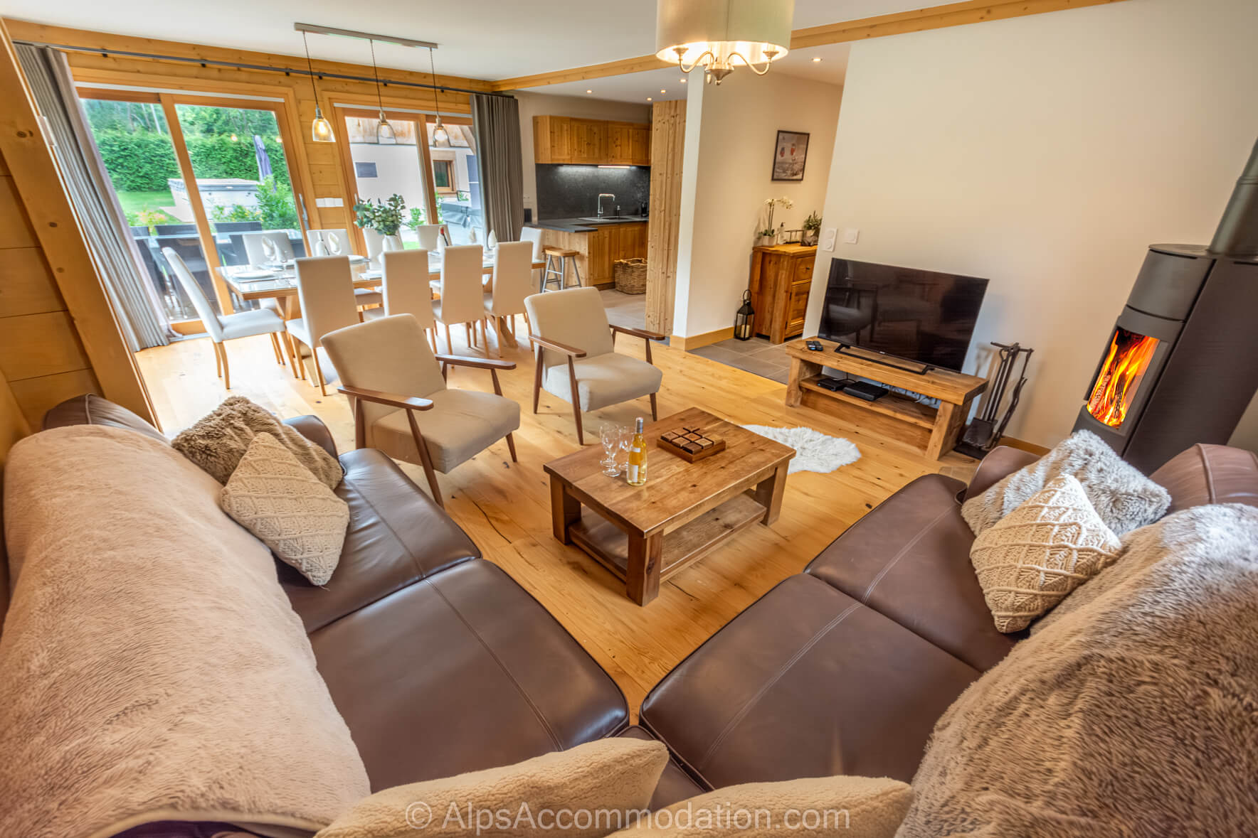 Continuez votre chemin et vous entrez dans l’espace ouvert salon, salle à manger et cuisine, une pièce spacieuse baignée de lumière. À gauche, le crépitement chaleureux du feu de bois, entouré d'un grand canapé et de fauteuils confortables à l’assise profonde. Une grande télévision avec chaînes satellite propose ses divertissements, tandis qu'une connexion Wi-Fi et une sélection de jeux de société familiaux sont également disponibles.