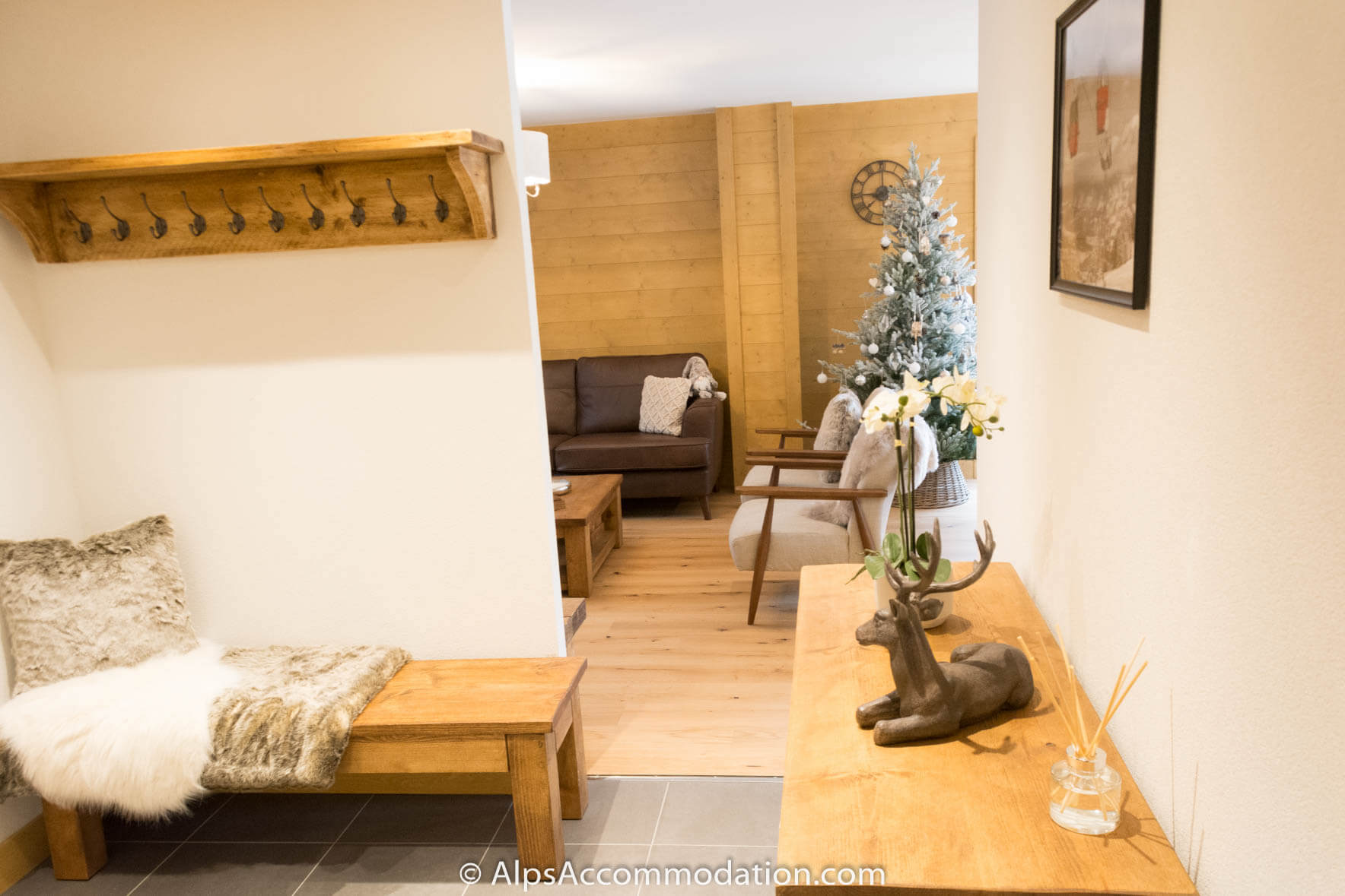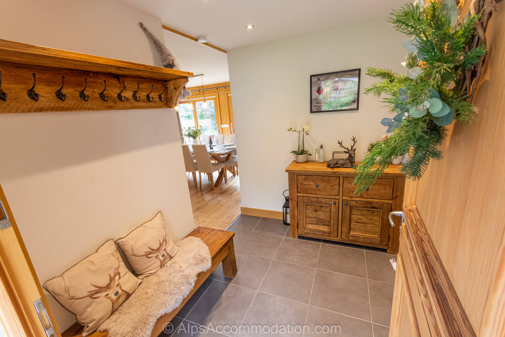 Vous pénétrez dans Chalet Louisa via un vestiaire joliment décoré de bougies, de tissus d'ameublement et de décorations charmantes, un hall qui offre également un bon espace de rangement pour les vêtements et les chaussures.