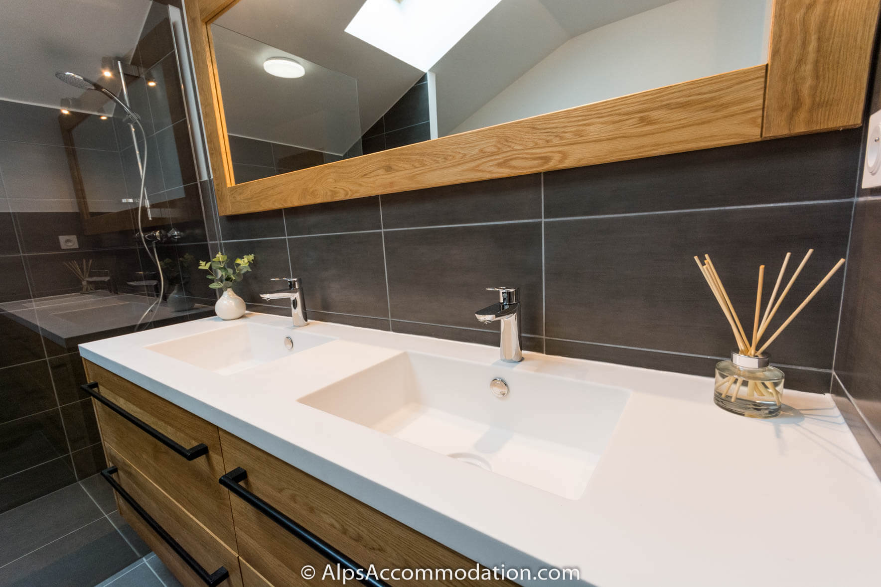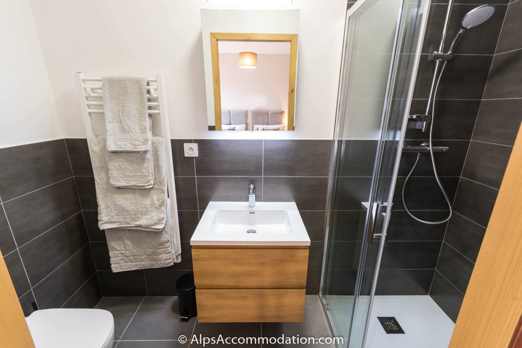 Dans la chambre 2, vous trouverez des lits jumeaux qui peuvent également être configurés en un lit double king-size (180 cm de large). La suite dispose d'une douche, d'un lavabo avec meuble sous vasque, d'un radiateur sèche-serviettes et d’un WC. Une armoire intégrée et une commode offrent un espace de rangement. Une porte vitrée donne accès à un balcon orienté sud (partagé avec la chambre 3) offrant une vue fantastique sur les jardins et les montagnes au-delà.