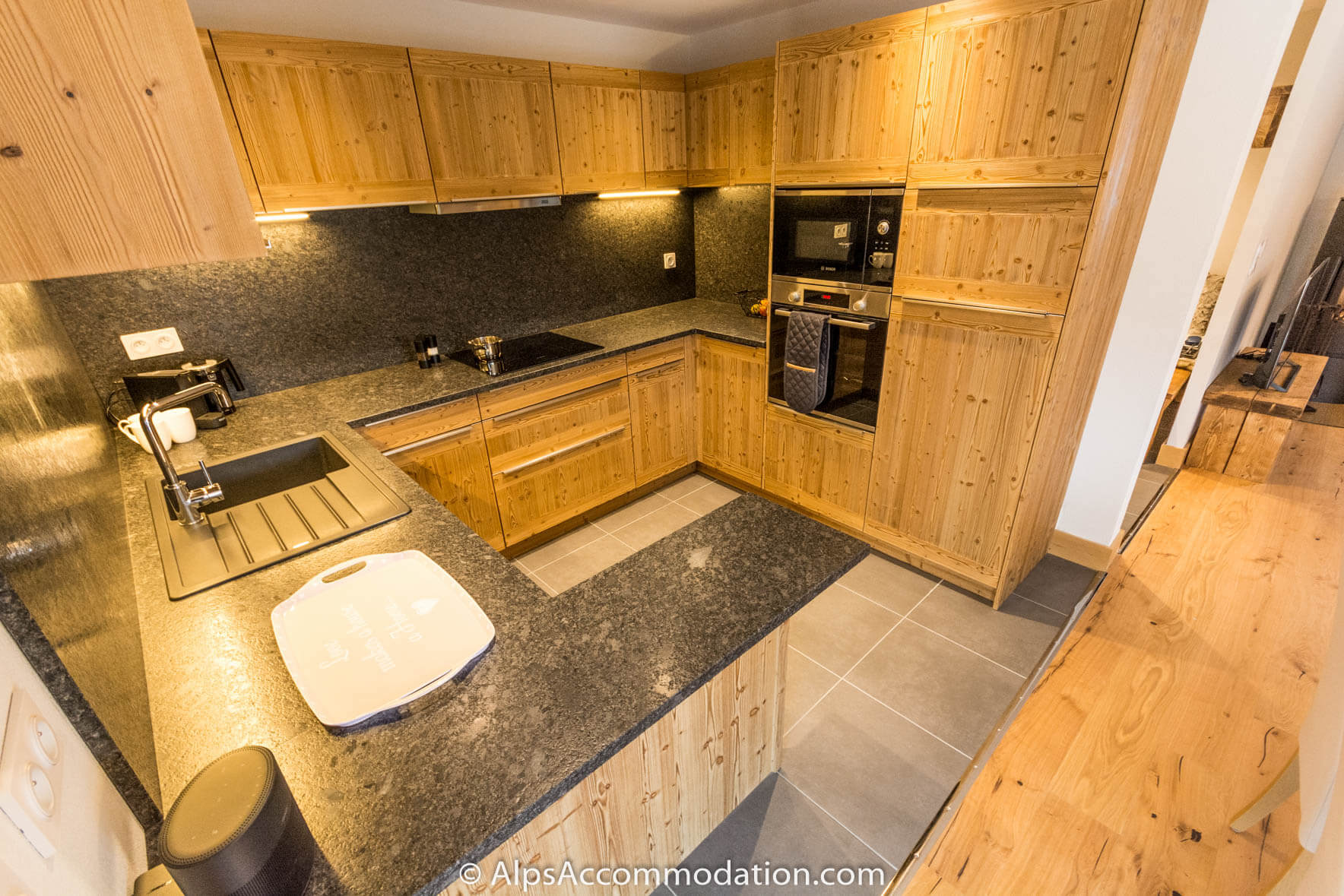 La cuisine est entièrement équipée, avec notamment une machine Nespresso avec mousseur à lait, des machines à raclette et à fondue, un four taille standard, un four micro-ondes et un lave-vaisselle.