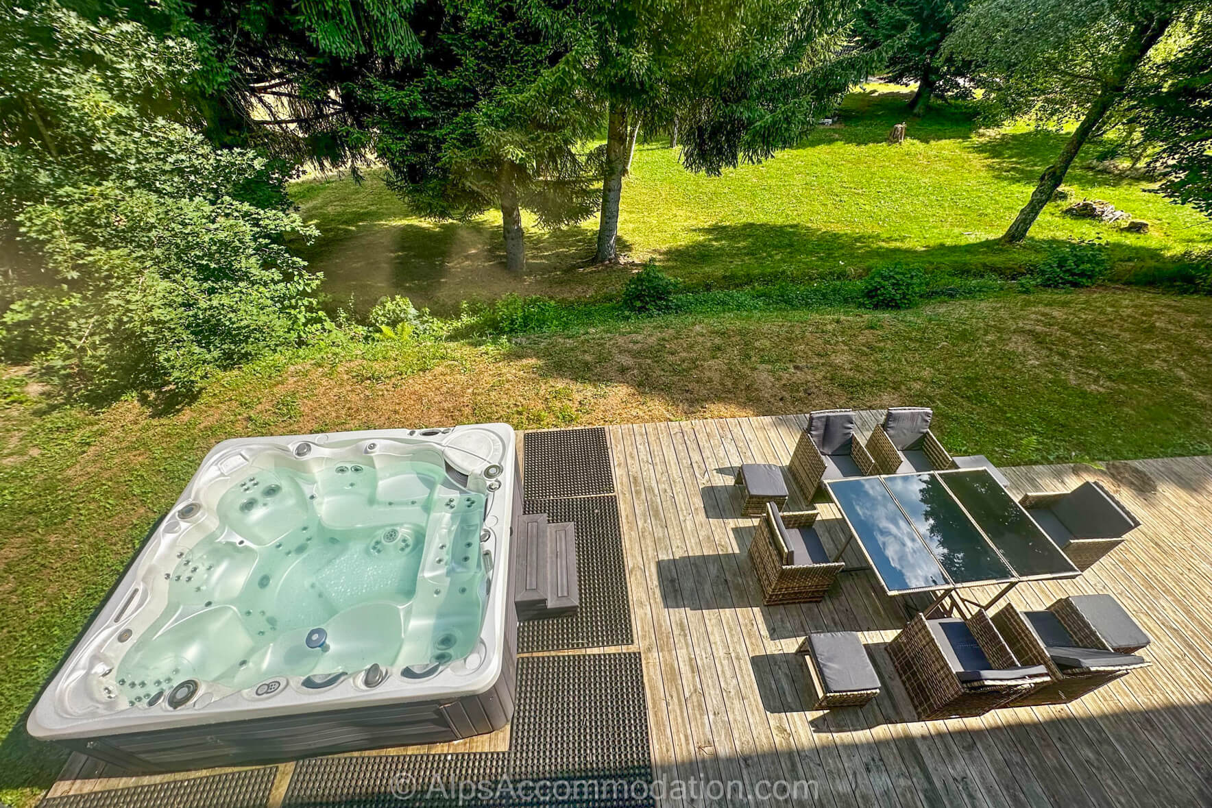 Les escaliers de ce balcon mènent à la terrasse du rez-de-chaussée, où une table de taille généreuse et de nombreux sièges créent un cadre idéal pour les repas en plein air. Le point fort de cette terrasse est le spa/bain à remous moderne, doté de jets, de souffleurs et même de fontaines, qui garantit une détente optimale. Accessible depuis le balcon ou par plusieurs des chambres du rez-de-chaussée, cette terrasse offre beaucoup d'espace aux enfants pour s’amuser et explorer.