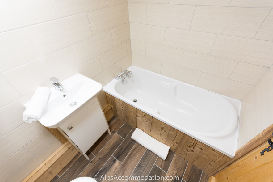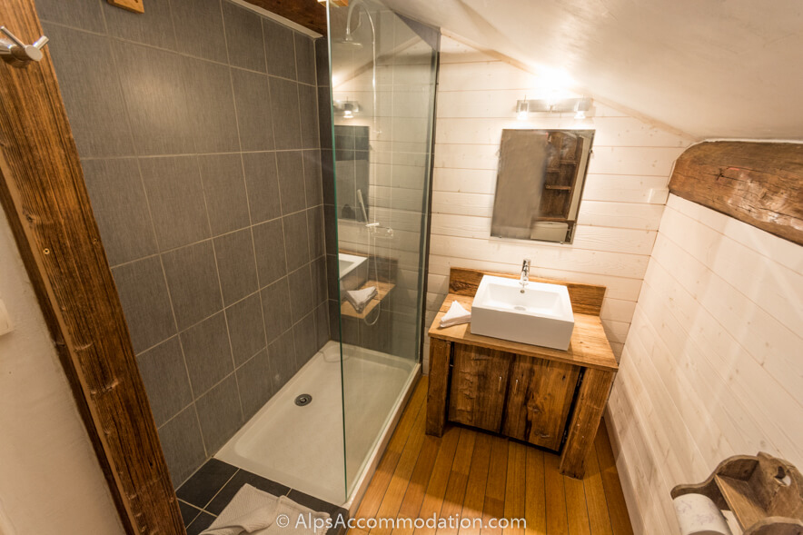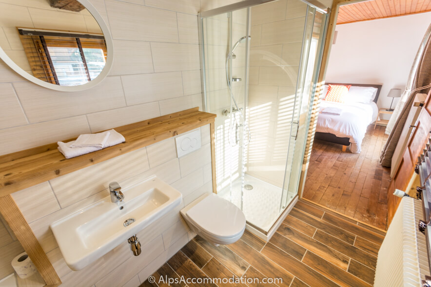A cet étage on trouve aussi la buanderie, avec un lave-linge, un lavabo et des wc. La WiFi gratuit, est disponible dans tous le chalet. Un lit et une chaise de bébé sont disponibles sur demande. Dans l’entrée, un escalier en bois permet d’accéder aux 4 chambres spacieuses.