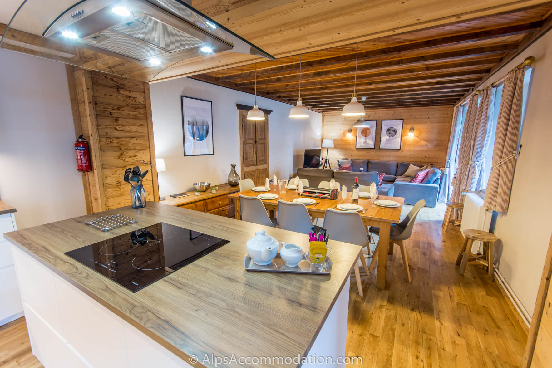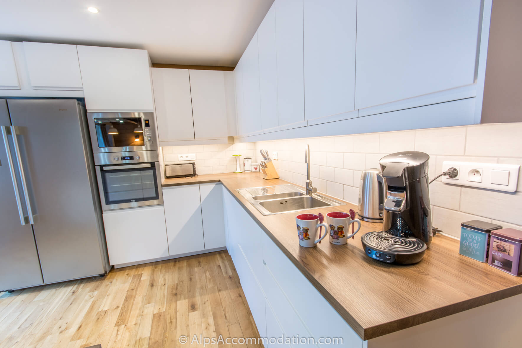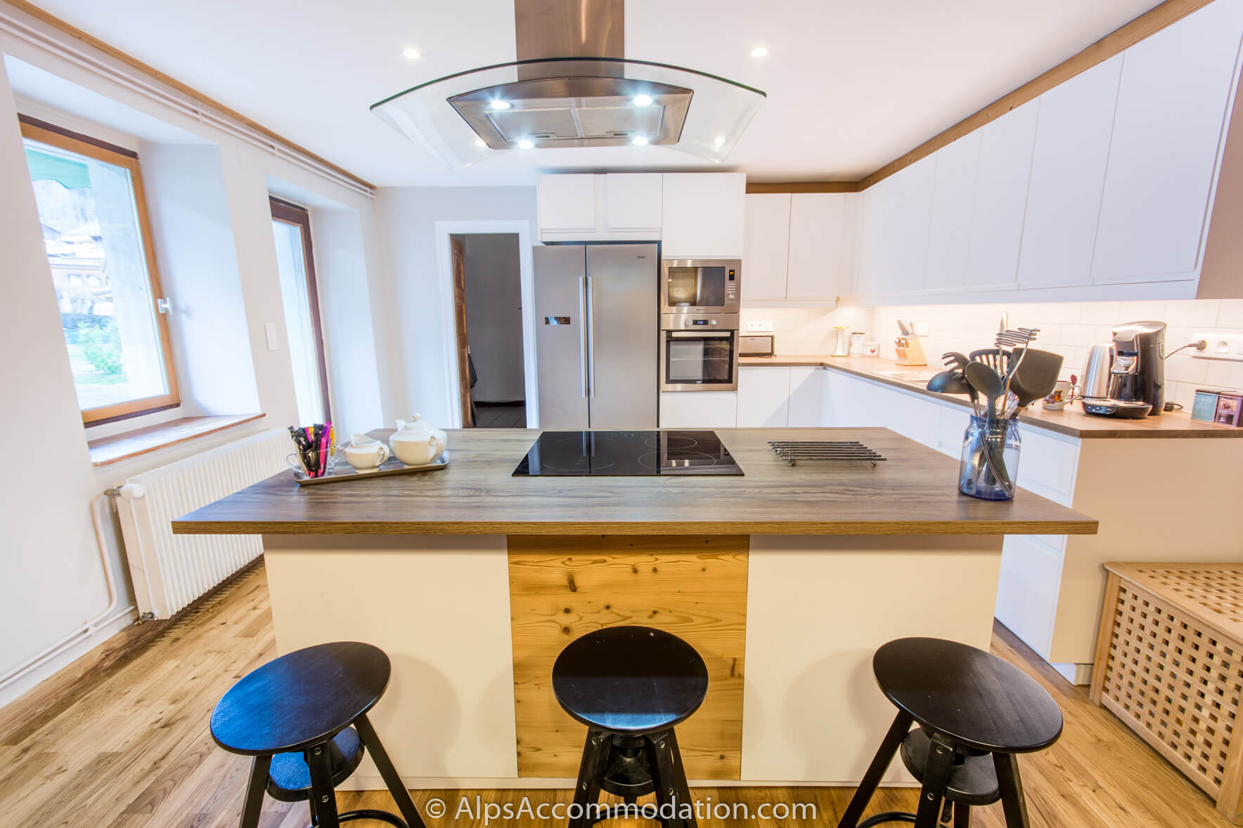 Le salon spacieux, de 7.3m de longueur, est idéal pour se détendre après une journée à la montagne. La cuisine contemporaine est superbement équipée avec un grand réfrigérateur/congélateur, style Américain, un machine à café Senseo, un appareil à raclette, un four encastre, un four à micro-ondes, un lave-vaisselle séparés, une plaque de cuisine en céramique avec un extracteur. Le plus de la cuisine c’est sa grande station de travail équipée de tiroirs profonds. Le grand espace de travail dans la cuisine est idéal pour préparer des repas pour de grands groupes, ainsi qu’un comptoir et des tabourets noirs, design.