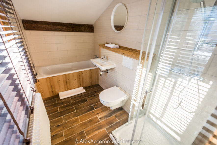 La chambre 1, au premier étage, à droite, comprend une salle de bain privée avec une grande douche, une baignoire, un lavabo et des wc. Cette chambre vous offre un grand lit « 150cm », luxueux, avec son matelas profond et confortable. Il y a aussi une grande armoire encastrée avec beaucoup de place, et une commode style ancien. La porte-fenêtre permet d’accéder au balcon. Une vue étonnante vous attend ! Il y a une salle de bain familiale à côté de la Chambre 1, avec une grande douche, un lavabo carré contemporain pose sur un placard en bois artisanal recyclé et des wc. Les poutres originales et un carrelage clair complètent le décor.