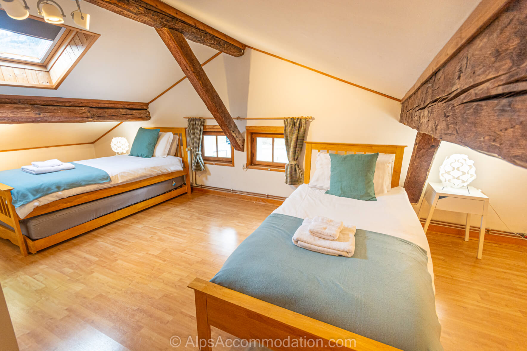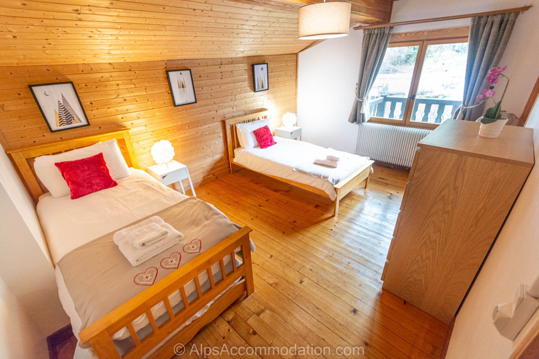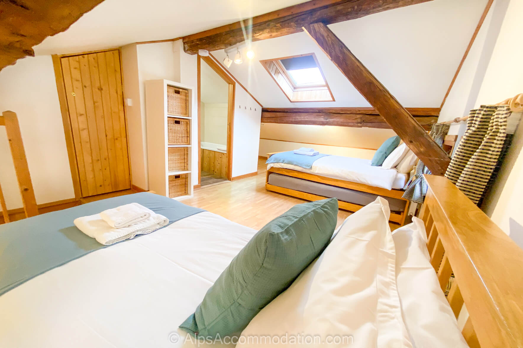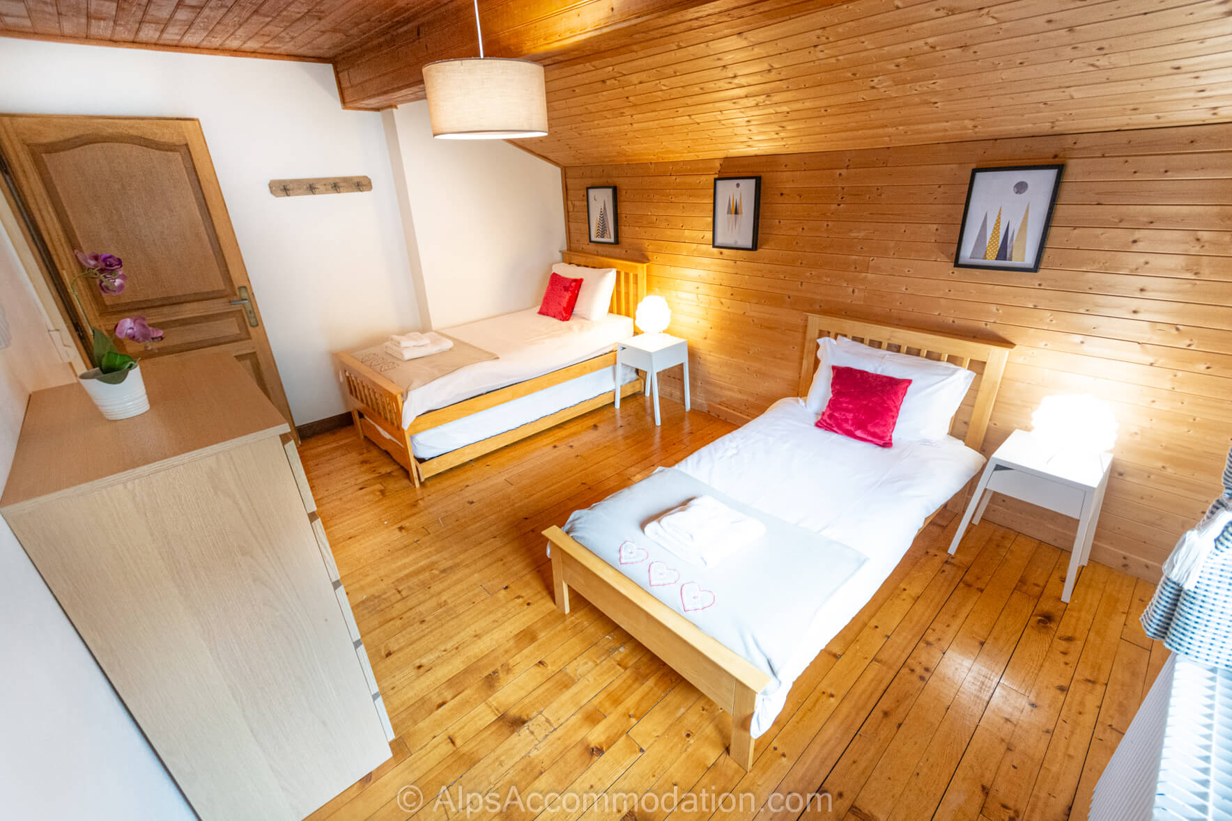 Au bout du couloir se trouve la chambre 3. Cette chambre possède deux lits simples et un lit gigogne si nécessaire. Il y a une grande commode et des patères pour accrocher vos vêtements. La vue sur les champs alpins est magnifique.