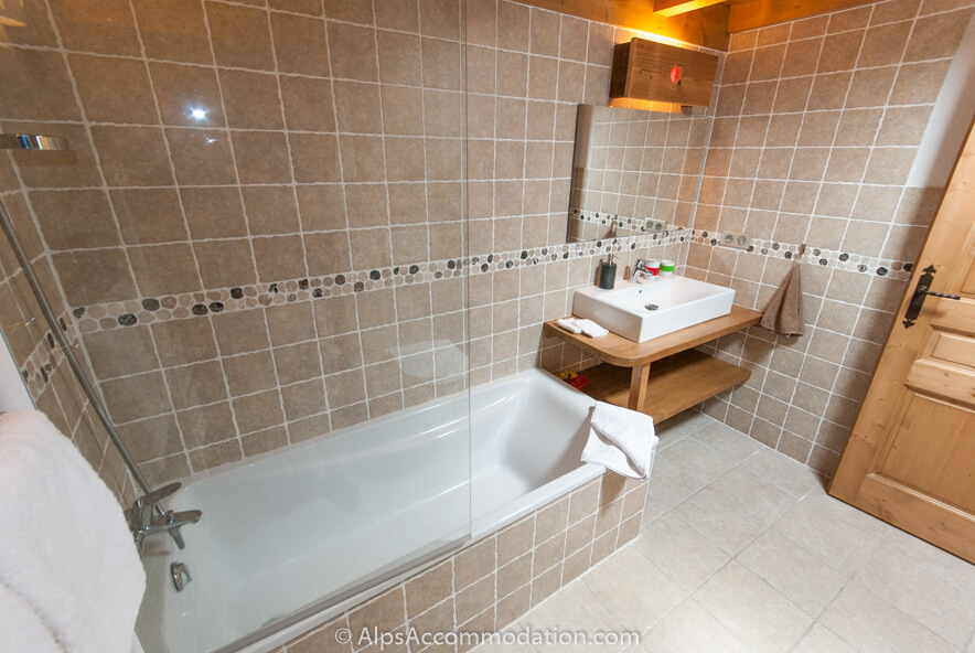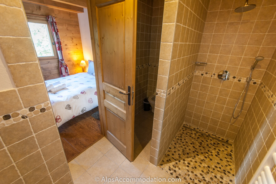 La Grange possède 6 chambres, spacieuses, aux détails de charme et de luxe – donc, on trouve une atmosphère très spéciale dans cette retraite alpine belle et accueillante. La Chambre No.1, grande chambre pour deux personnes (lit double : 160cm x 200cm) est située au premier niveau inférieure du chalet-appartement. Il y a une grande armoire et un bureau. La salle de bain privée avec lavabo, douche et WC. Il y a aussi un placard pour les articles de toilette et un porte-serviettes chauffant.