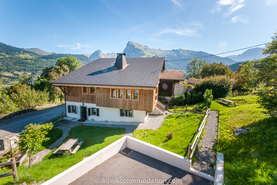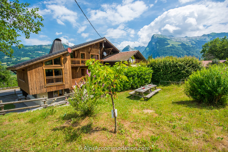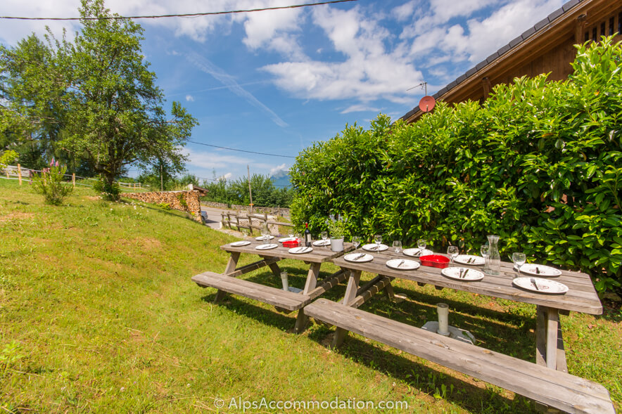 Dans les jardins, des tables de pique-nique sont à votre disposition, vous permettant de dîner en plein air et de profiter des mois d’été tout en admirant la vue sur la vallée du Giffre en contrebas.