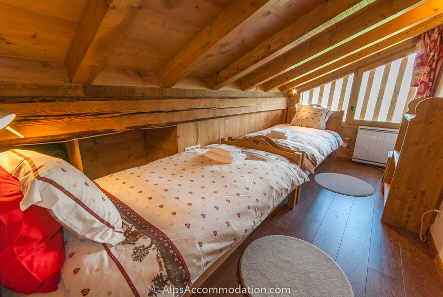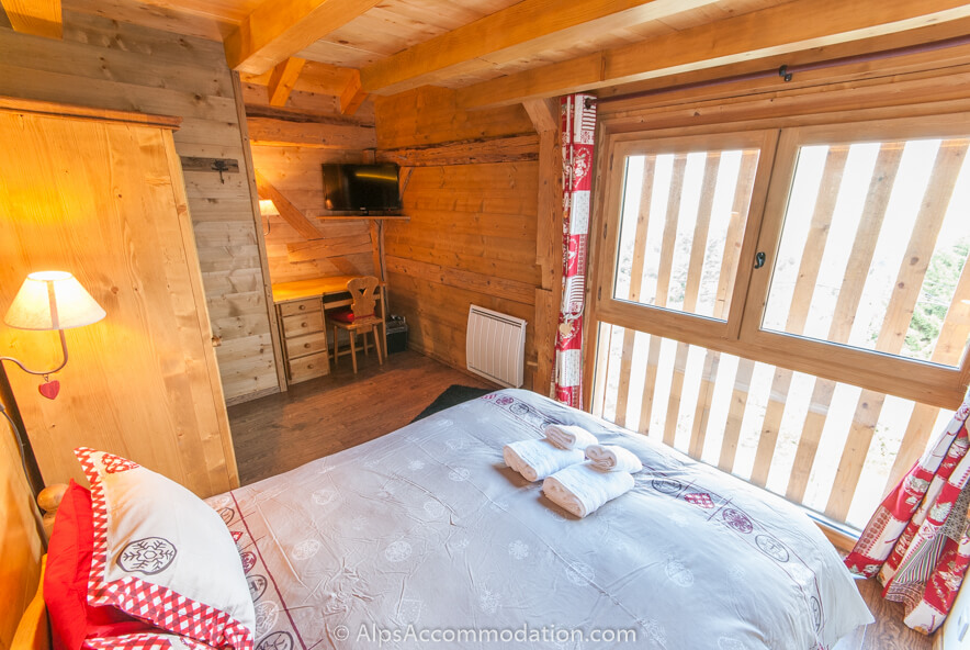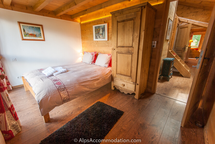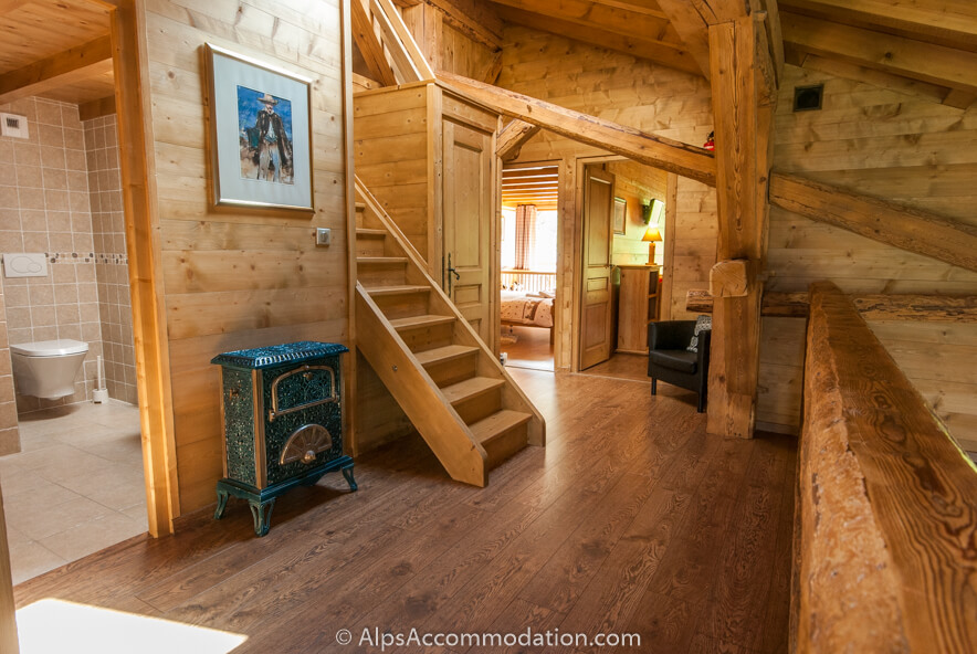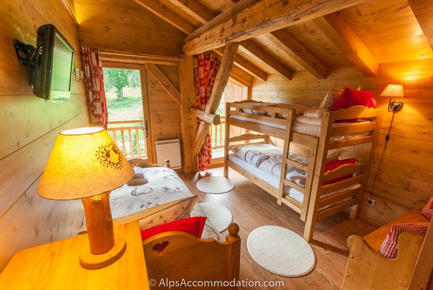 On accède à la Chambre no 2, par l’escalier. La fenêtre de cette chambre grande qui va du sol au plafond offre une vue panoramique sur La Vallée du Giffre. Cette chambre est équipée d’un bureau, d’une grande armoire, et d’une TV/ DVD. La salle de bain No. 2 à une douche et un WC. La Chambre No.3 est de l’autre coté du palier. Cette chambre, peut accueillir trois personnes car elle est équipée d’un lit double superposé et d’un lit simple. Elle est équipée d’étagères, d’un charmant banc rustique en bois, et d’une TV avec lecteur de DVD. De cette chambre on peut accéder au balcon pour admirer les champs derrière la ferme et, au loin, la montagne.