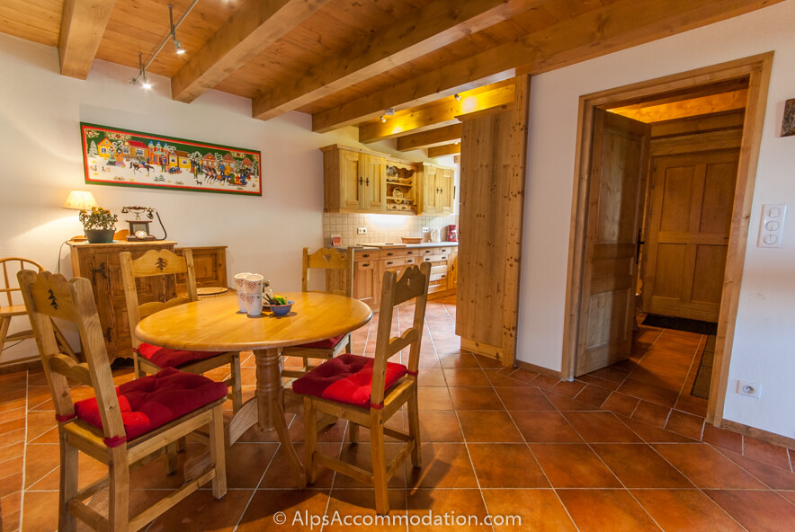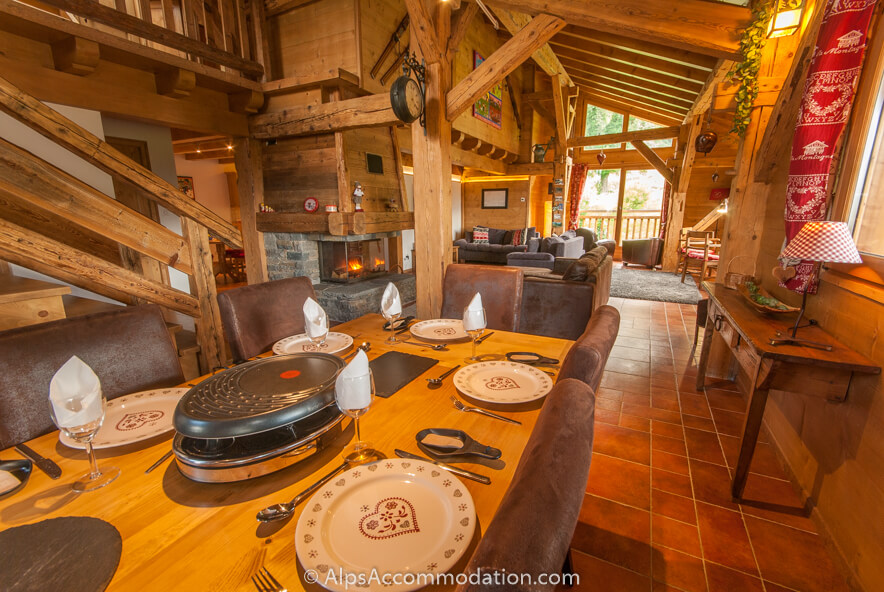 A gauche, un peu loin du grande cheminée, est situé le très grand espace salon et salle à manger. La table à diner, très longue, peut accueillir des grands groupes, en tout confort, et il y a une seconde table, plus petite, sous l’escalier, idéale pour les jeunes enfants. Apres un repas délicieux, on peut se détendre devant la cheminée, se relaxer a un des deux canopés confortable (ou vous pouvez choisir une des deux grandes fauteuils), à écouter la musique, ou regarder un DVD ou le télévision connectée, avec un choix des chaines satellite. Une grand sélection des livres, jeux, et cartes a jouer, sont aussi disponibles. Donc, on peut profiter des vacances sportifs, mais aussi très relaxant et, pour être au courant avec vos affaires, utiliser le petit bureau de travail, avec de l’espace pour deux copains! Wi-Fi est disponible partout pour nos clients à La Grange Samoens
