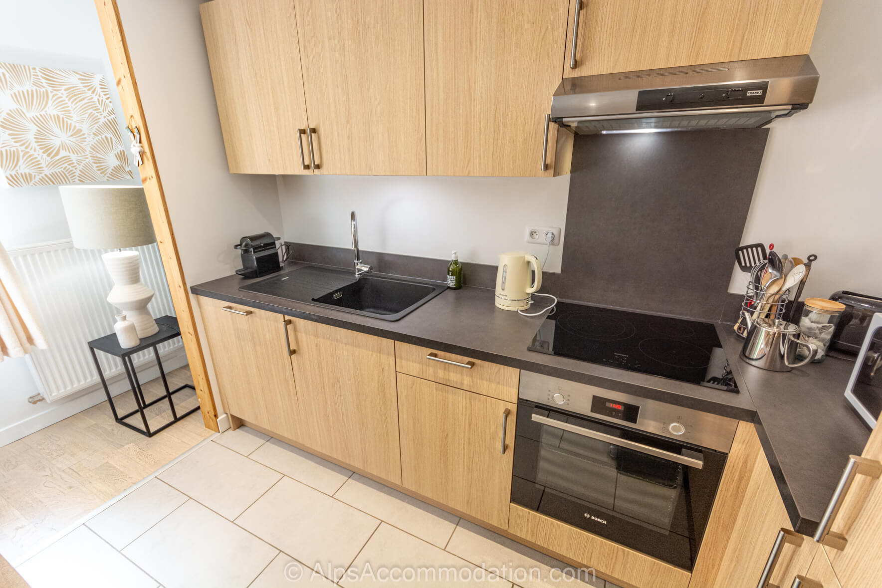 La cuisine moderne est entièrement équipée d'appareils électroménagers haut de gamme, dont un four électrique à chaleur tournante, un lave-vaisselle, une plaque de cuisson électrique et une machine à café Nespresso.