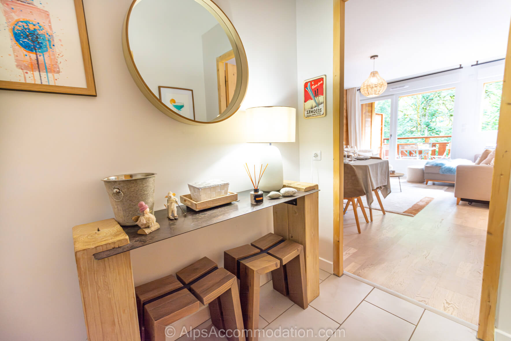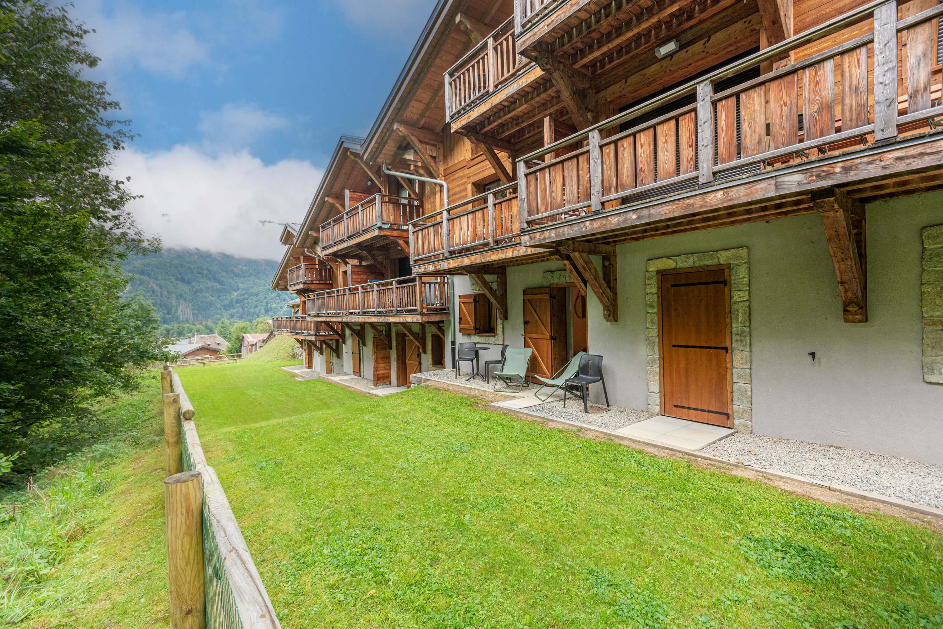 Un jardin plat partagé devant la propriété, ainsi qu'une petite terrasse équipée d'une table et de chaises, offrent un endroit tranquille pour jouer ou se détendre, avec le bruit apaisant du torrent du Clévieux. Des chaises longues sont à disposition.